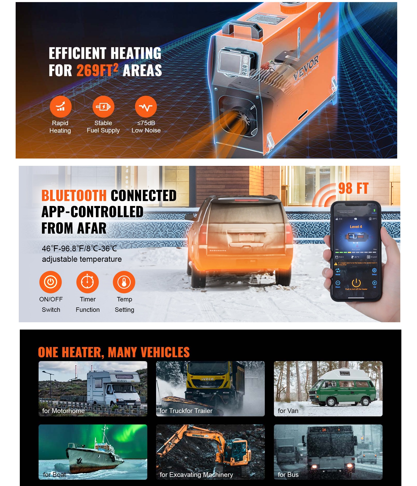 Telefon=controler: Cel mai recent incalzitor diesel imbunatatit dispune de un control Bluetooth imbunatatit pentru un confort si mai mare. Pur si simplu descarcati aplicatia si obtineti controlul pentru a va preincalzi incalzitorul de la o distanta de pana la 98 ft/30 m. Si vine, de asemenea, cu o telecomanda de 32 ft/10 m si LCD; alegeti metoda de control convenabila. Temperatura poate fi reglata de la 46,4 °F-96,8 °F/8 °C-36 °C, in functie de nevoile dumneavoastra specifice.