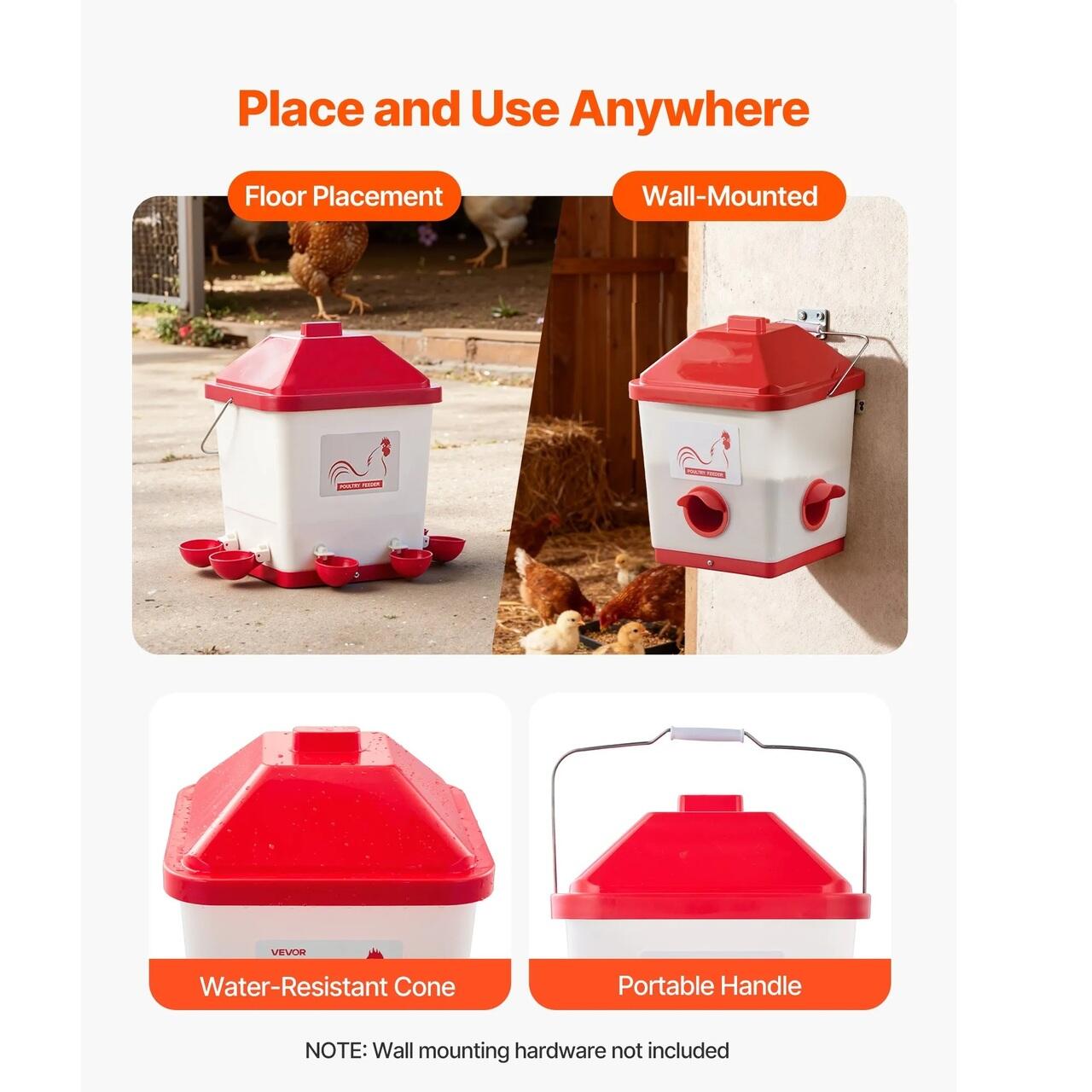 Usor de utilizat si de mutat: Echipata cu un maner convenabil pentru o mutare fara efort, hranitoarea noastra impermeabila pentru pui poate fi asezata pe sol sau agatata pe pereti sau garduri. Ideala pentru cotete interioare, ferme mici si cotete de gaini, permitand o utilizare flexibila si simpla.