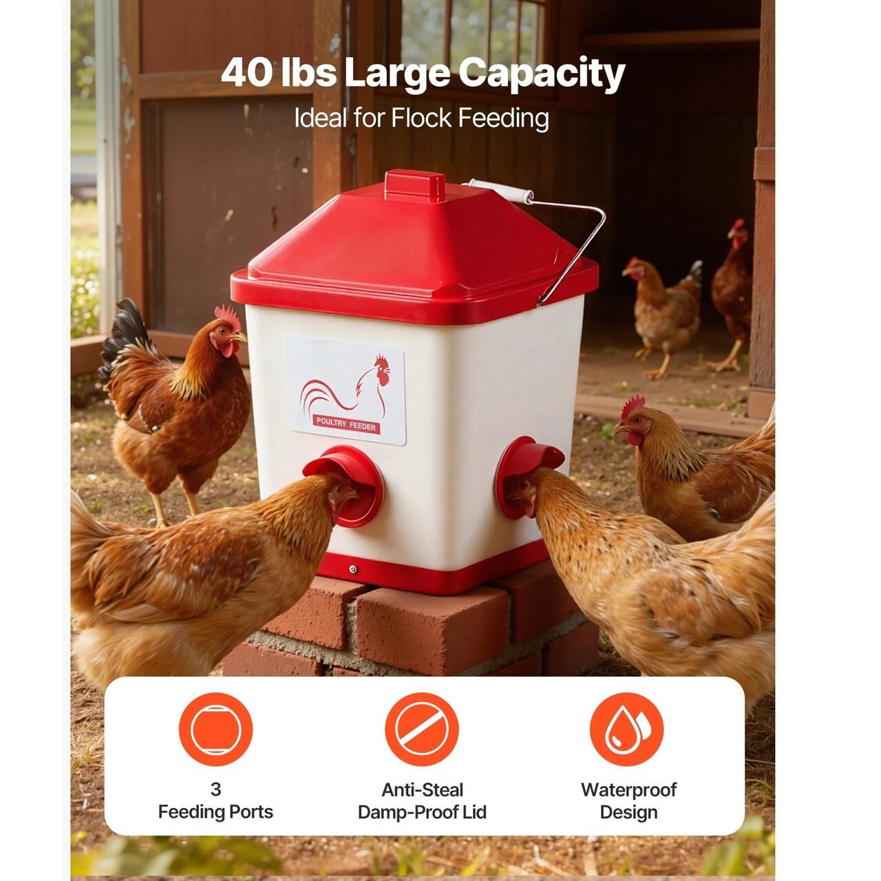 Capacitate mare de 18 kg: Acest hranitor automat pentru pasari de curte are o capacitate de 18 kg de hrana, putand hrani 10-12 pui adulti timp de 12-17 zile. Dispune de trei orificii de hranire, un design extins, inele de etansare si capace impermeabile pentru a proteja impotriva furtului si a ploii.