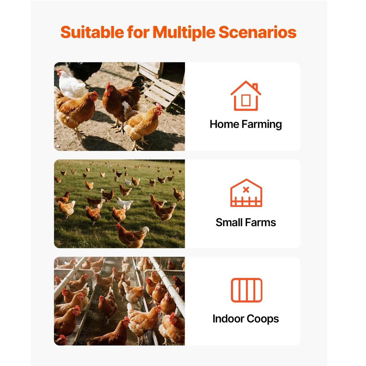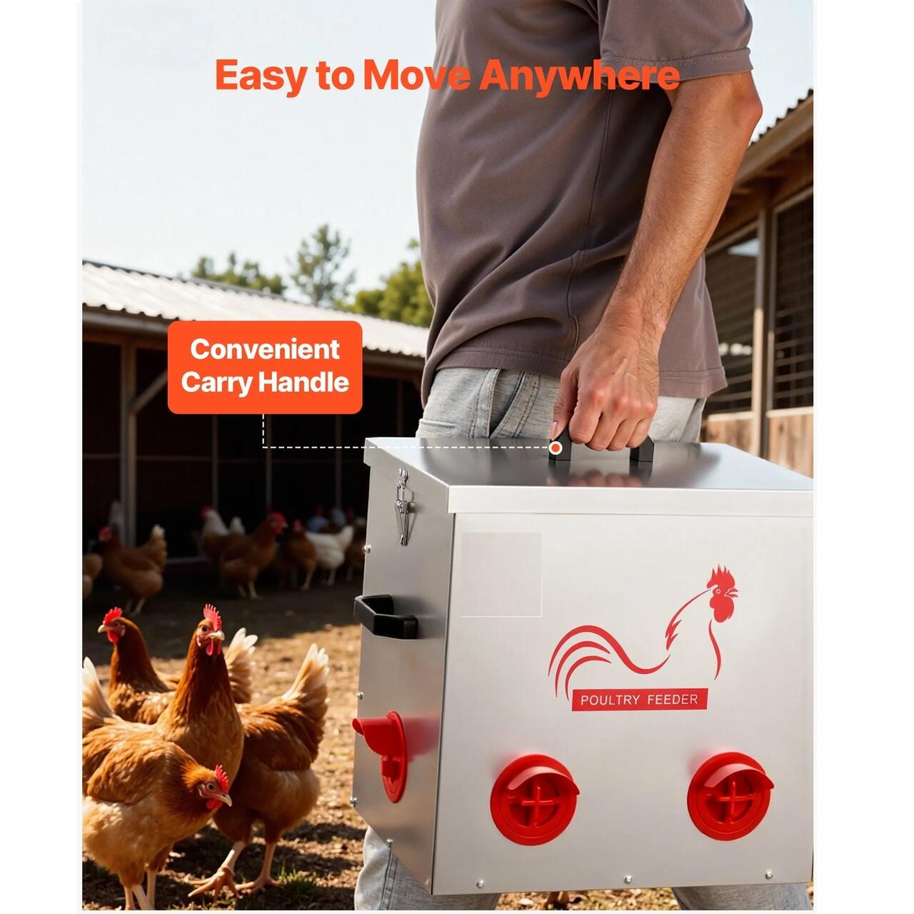Usor de mutat oriunde: Acest hranitor automat pentru pui este dotat cu manere pe ambele parti si in partea de sus, permitand o mutare usoara. Simplifica hranirea zilnica, reduce dificultatile de a transporta recipiente grele de hrana si face ingrijirea pasarilor de curte mai convenabila.