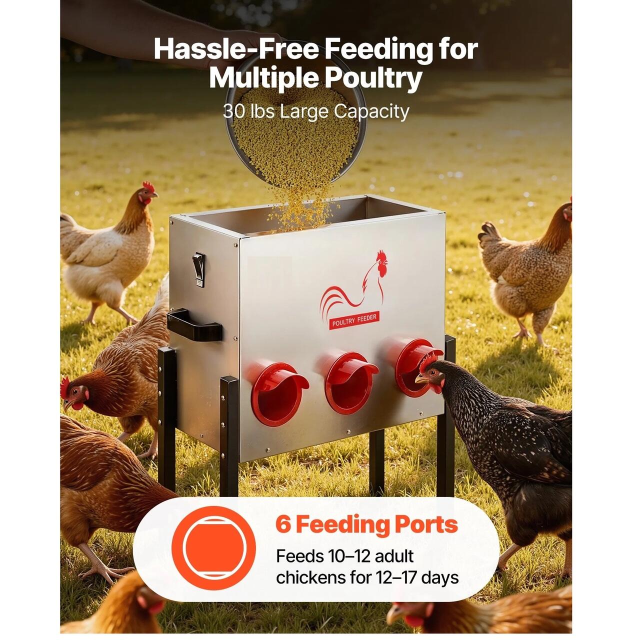Capacitate mare de 13,6 kg: Acest hranitor automat pentru pui are o capacitate de 13,6 kg de pelete mici, firimituri sau furaje zdrobite, oferind hrana pentru 12-17 zile pentru 10-12 pui adulti. Cele 6 orificii de hranire permit hranirea mai multor pui simultan, economisind timp si reumpleri zilnice.