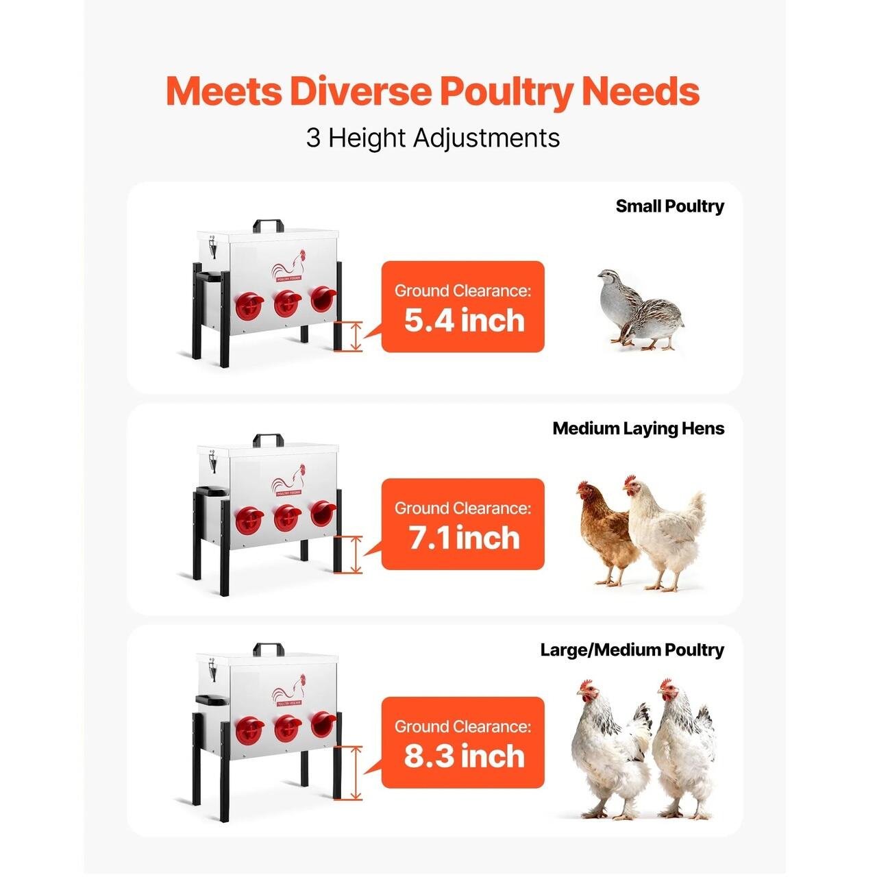 Trei reglabile pe inaltime: Hranitorul automat pentru pasari de curte accepta trei reglaje pe inaltime (5,4 in/7,1 in/8,3 in) pentru a se potrivi pasarilor de curte de dimensiuni mici si medii. Se adapteaza pe masura ce efectivul creste, asigurand utilizarea pe termen lung fara achizitii suplimentare, economisind costuri.