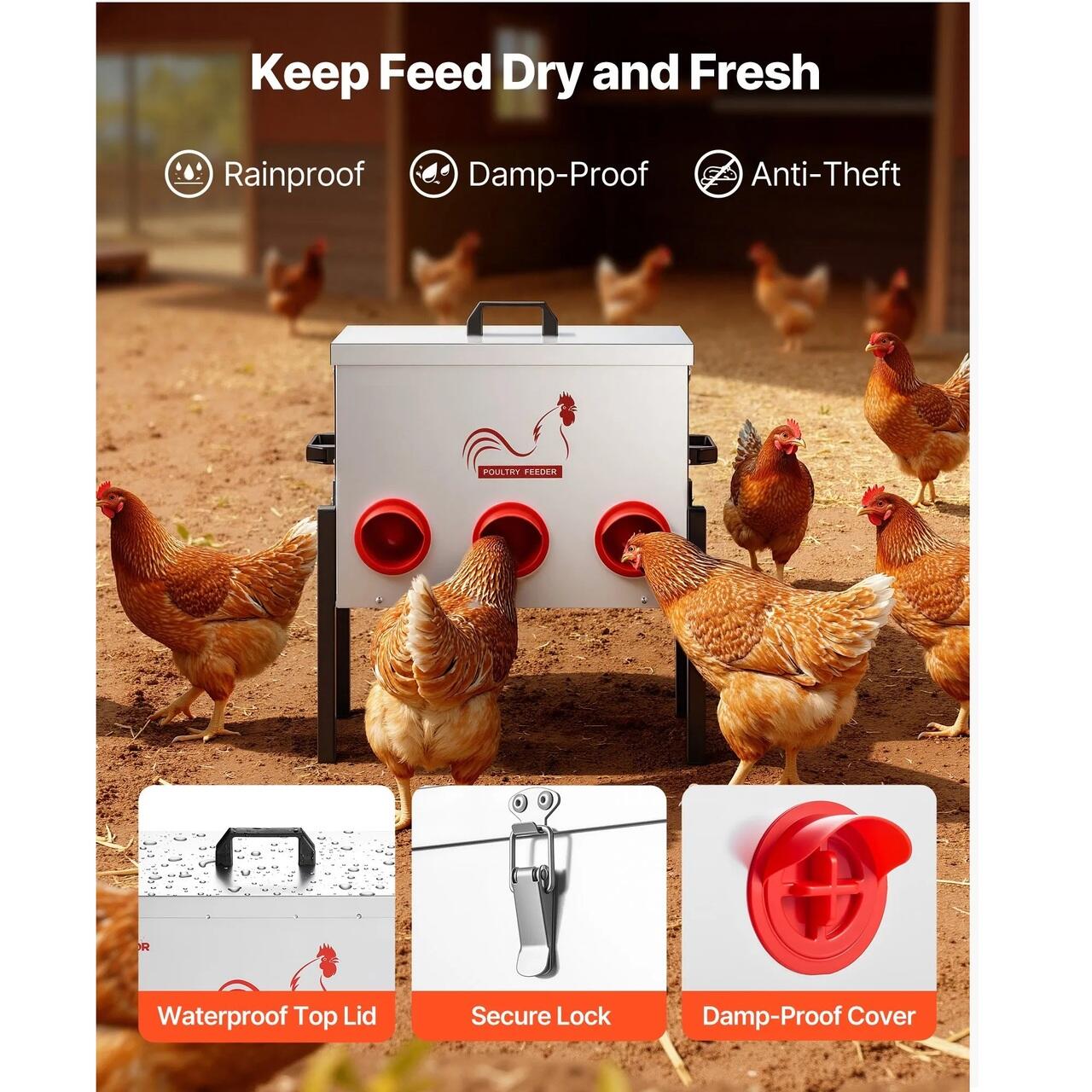 Hrana proaspata si curata: Hranitorul pentru pui are un capac complet, blocabil si impermeabil, orificii de hranire cu inele de etansare, plus un design extins pentru a bloca umezeala. Adaugarea unui capac impermeabil la orificii mentine hrana uscata si sigura.