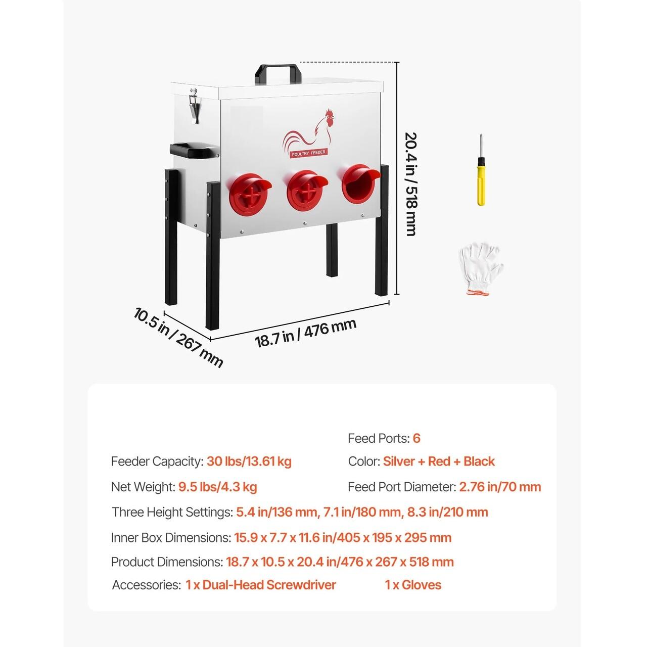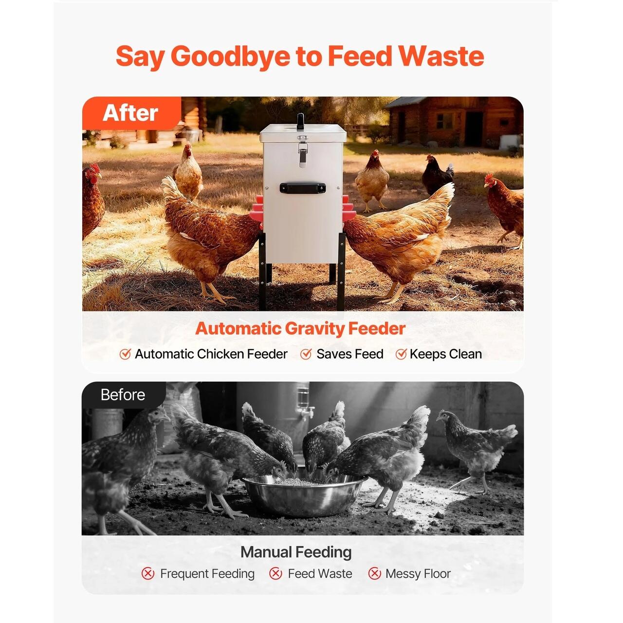 Durabil si construit pentru a rezista: Fabricat din otel galvanizat cu orificii de alimentare din PP, acest hranitor de pui impermeabil este rezistent la rugina si coroziune si usor de curatat. Picioarele din otel ranforsat sunt potrivite pentru utilizare in interior sau in exterior. Cu un manual detaliat si unelte pentru asamblare rapida.
