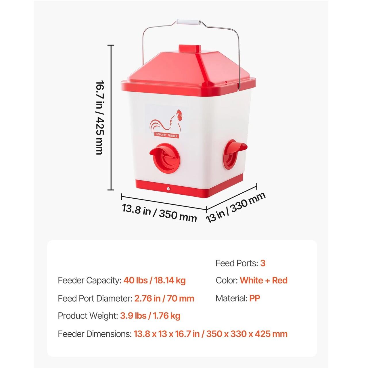 Hranire automata ideala: Aceasta hranitoare automata pentru pui de 18 kg este dotata cu 3 orificii. Fabricata din PP durabil, este durabila si sigura, in timp ce designul de alimentare gravitationala mentine hrana proaspata si curata, economisind timp si efort, chiar si in timpul absentelor scurte.