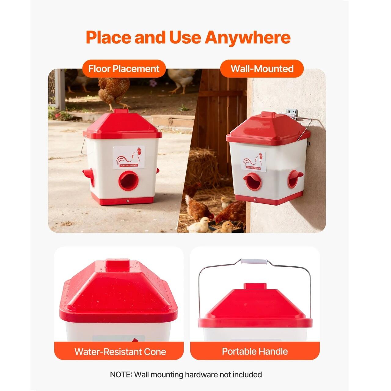Usor de utilizat si de mutat: Echipata cu un maner convenabil pentru o mutare fara efort, hranitoarea noastra impermeabila pentru pui poate fi asezata pe sol sau agatata pe pereti sau garduri. Ideala pentru cotete interioare, ferme mici si cotete de gaini, permitand o utilizare flexibila si simpla.