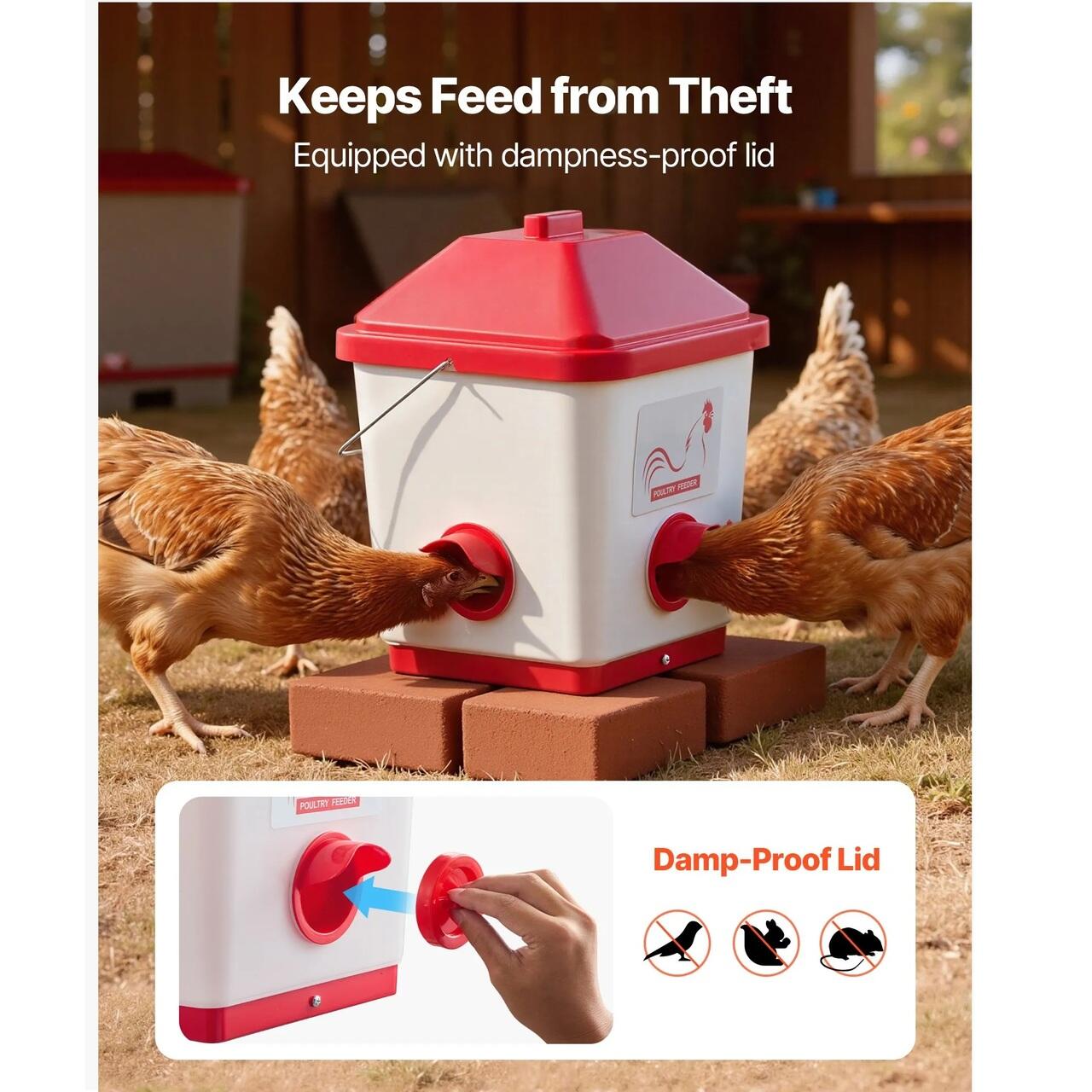 Pastreaza hrana in siguranta: Fiecare orificiu de hranire al hranitorului de pui este dotat cu un capac detasabil impermeabil pentru a impiedica animalele precum veveritele si pasarile sa fure hrana. Reduce pierderile de hrana atunci cand este plasata in aer liber, asigurand ca hrana pasarilor de curte ramane in siguranta.