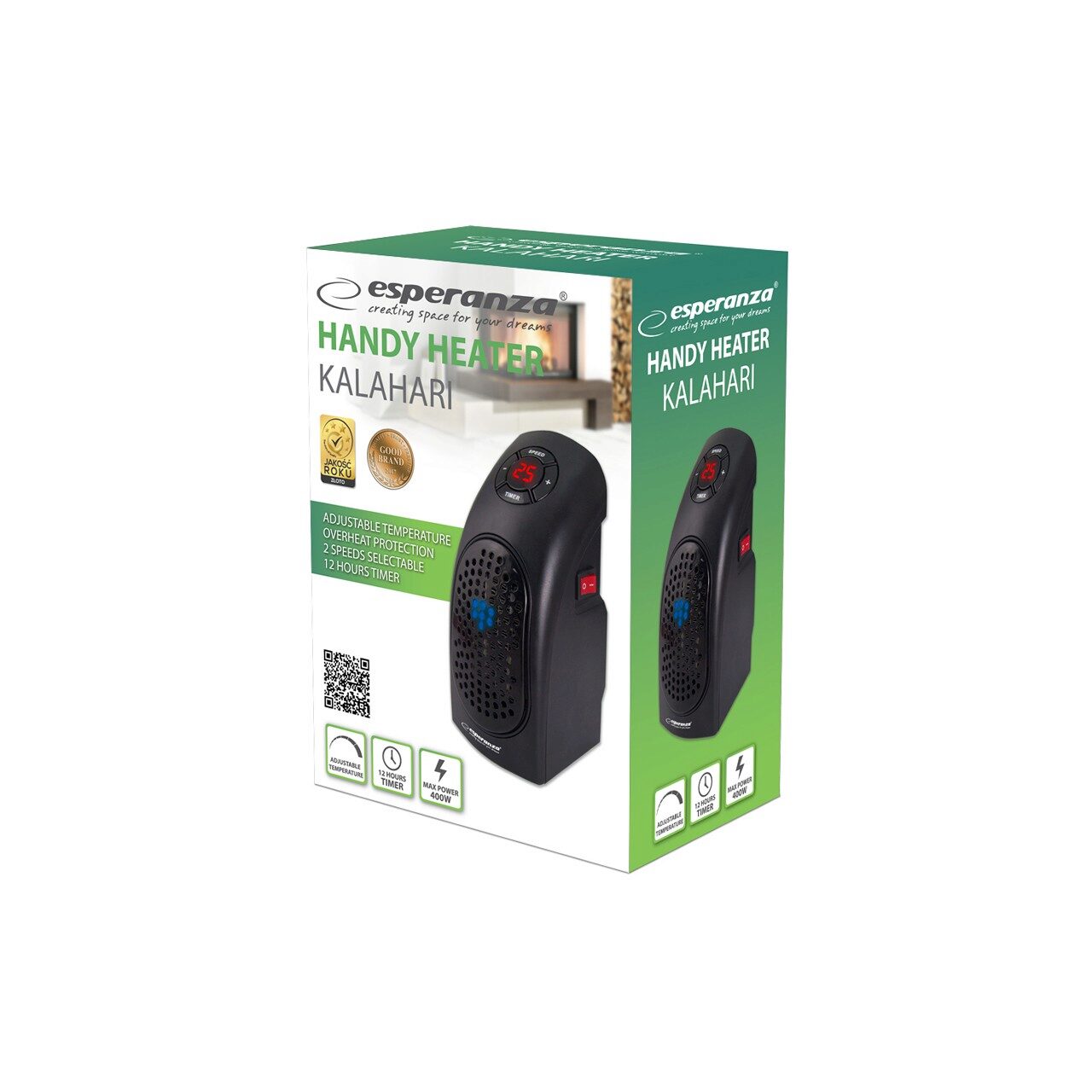 Încălzitorul Esperanza este soluția perfectă pentru încălzirea casei. Încălziți rapid și eficient o baie sau camera copilului în zilele reci. Dimensiunea portabilă se potrivește perfect și pentru camping. Designul modern și drăguț este potrivit pentru a decora orice interior Alimentare: 220 - 240 VAC, 50/60 Hz Temporizator: 12 ore 2 viteze selectabile Putere: 400 W Culoare: negru Protecție la supraîncălzire
