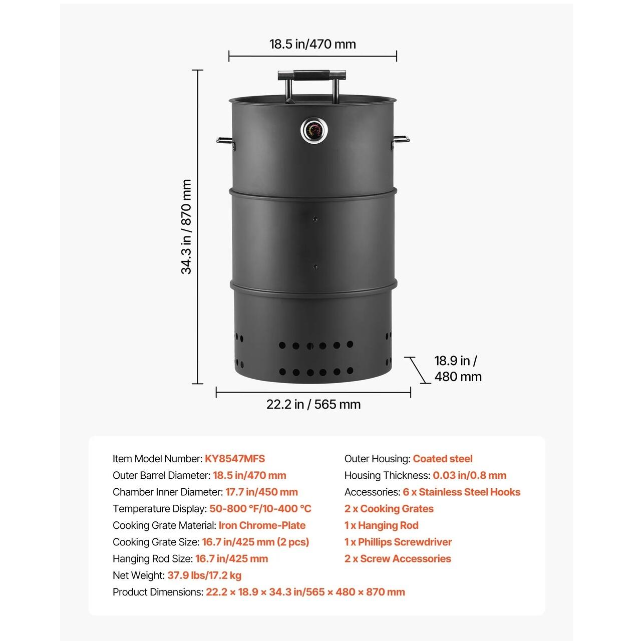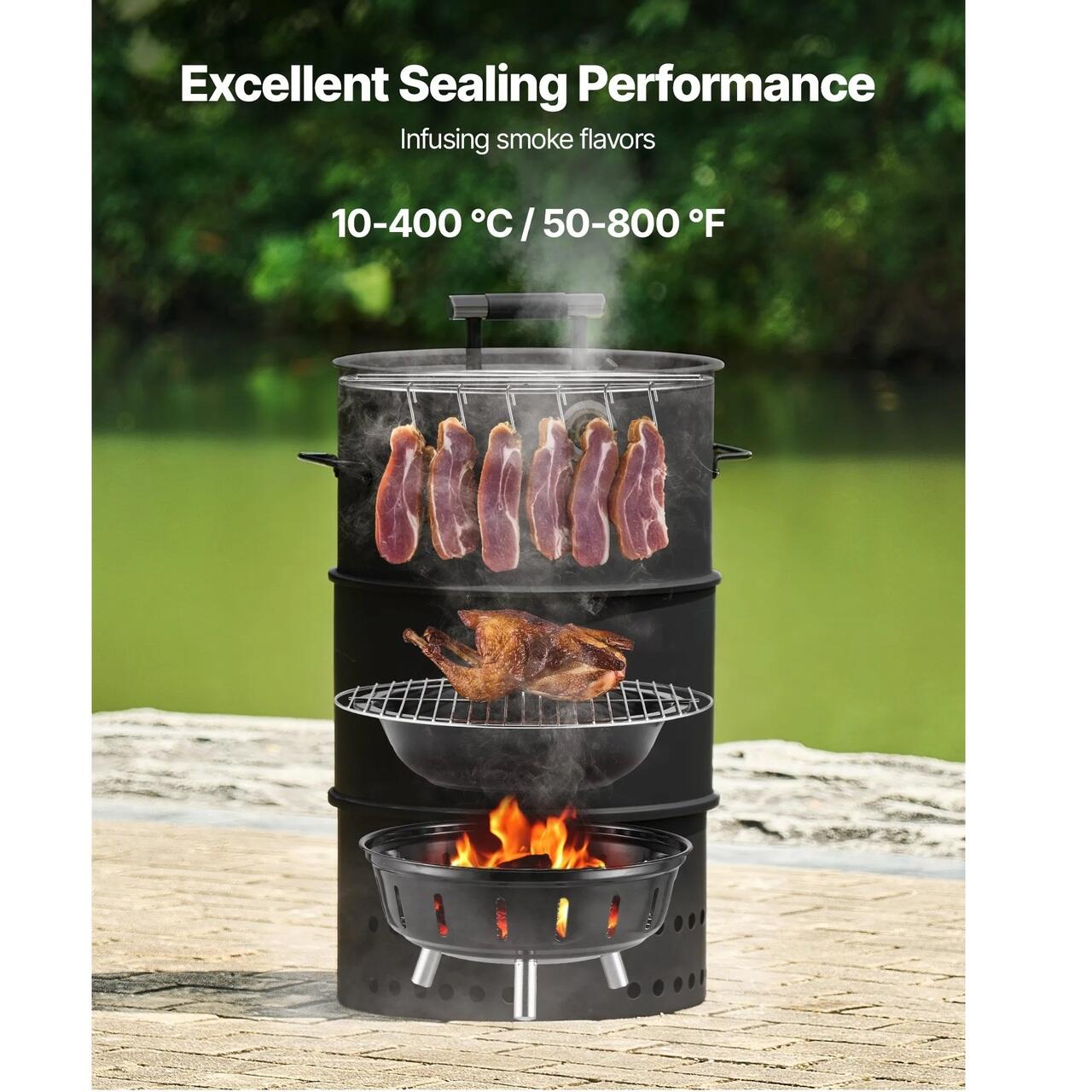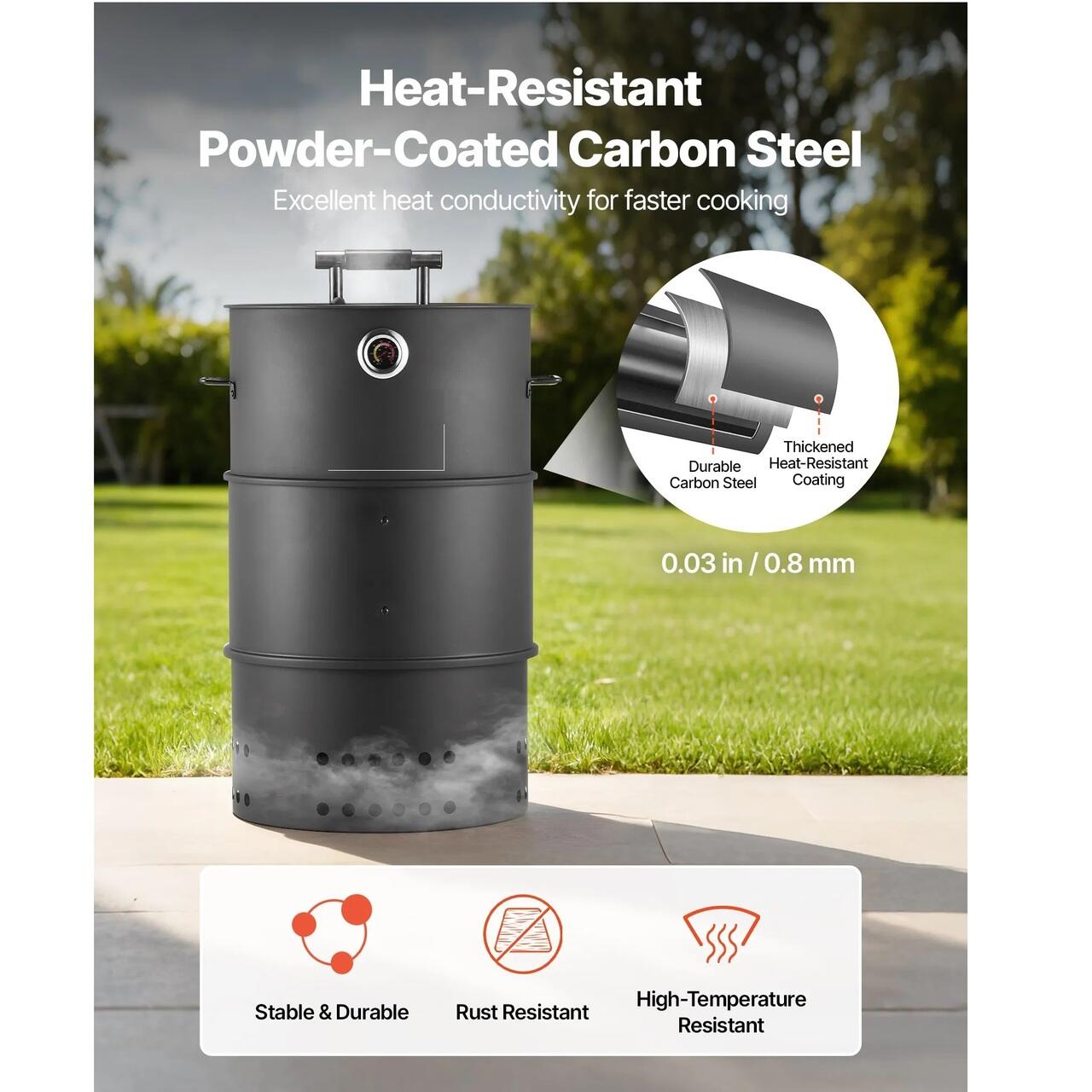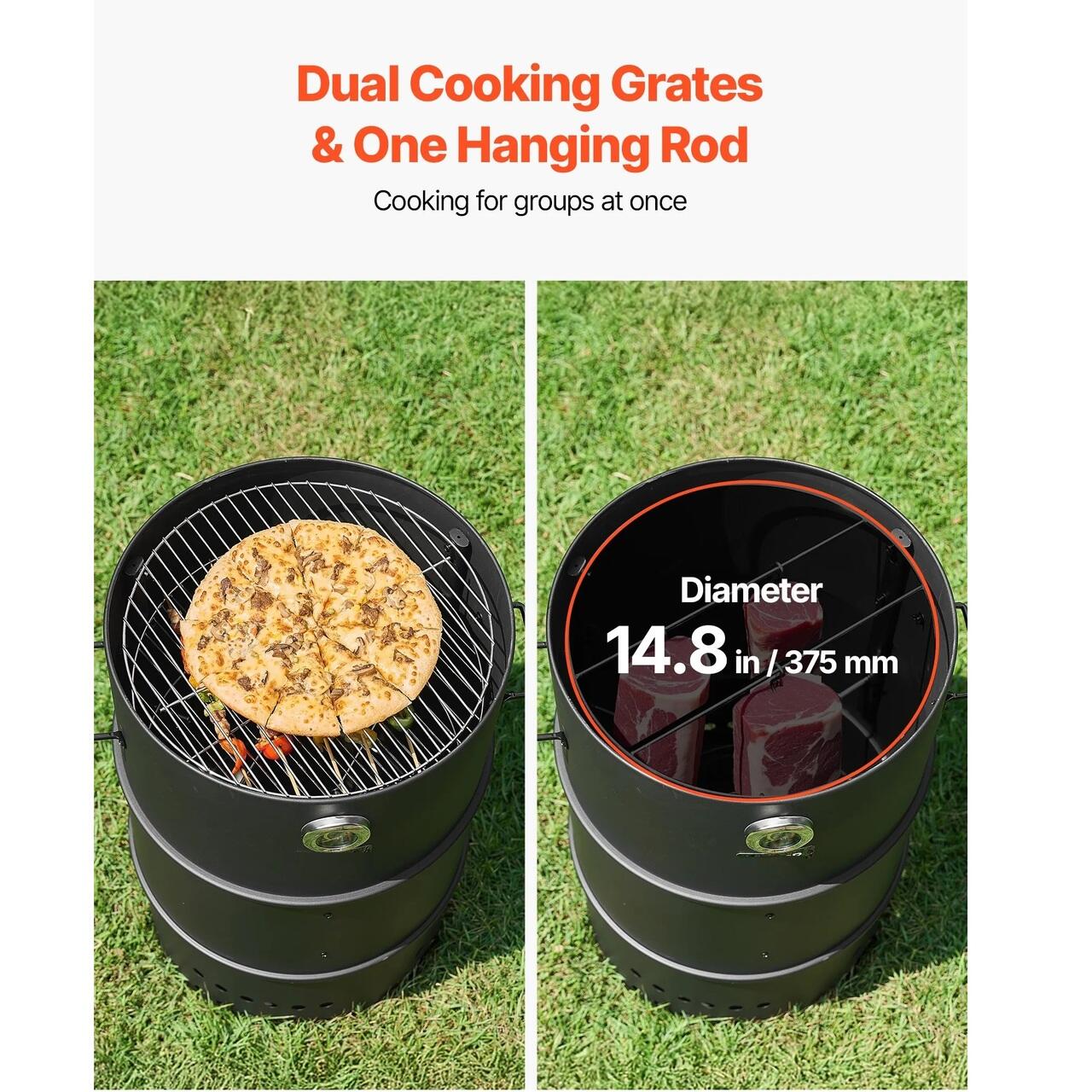 Utilizare versatila 4 in 1: Afumatoarea cu carbune include 2 gratare de gatit si o tija de agatare pentru mai multe optiuni de gatit. Deschideti capacul pentru gratar cu un singur strat sau doua straturi, inchideti-l pentru afumare cu doua straturi sau agatati carnea pe tija pentru o afumare bogata si aromata.