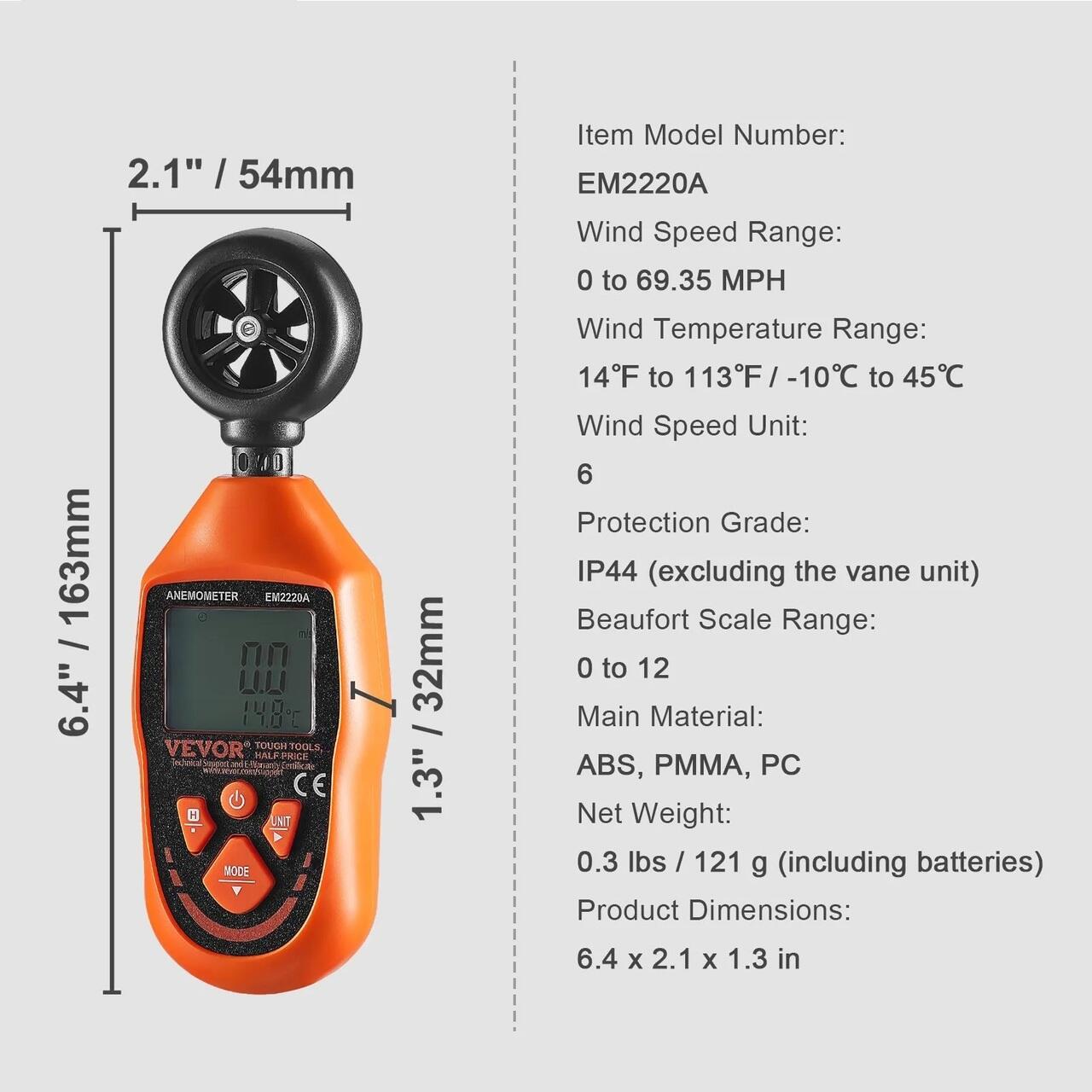 Adaptabil la toate conditiile: Esti pregatit pentru un dispozitiv de masurare a vitezei vantului care functioneaza in orice conditii? Ploaie sau ninsoare, anemometrul nostru te acopera. Cu un grad de impermeabilitate IP44 (cu exceptia unitatii cu palete), asigurand masuratori precise. Verificatorul de viteza a vantului dispune de un mod de oprire automata, care se opreste dupa 5 minute de inactivitate si o alerta de baterie descarcata, astfel incat sa nu fii niciodata luat prin surprindere.