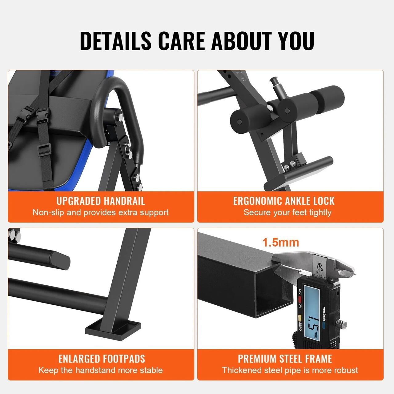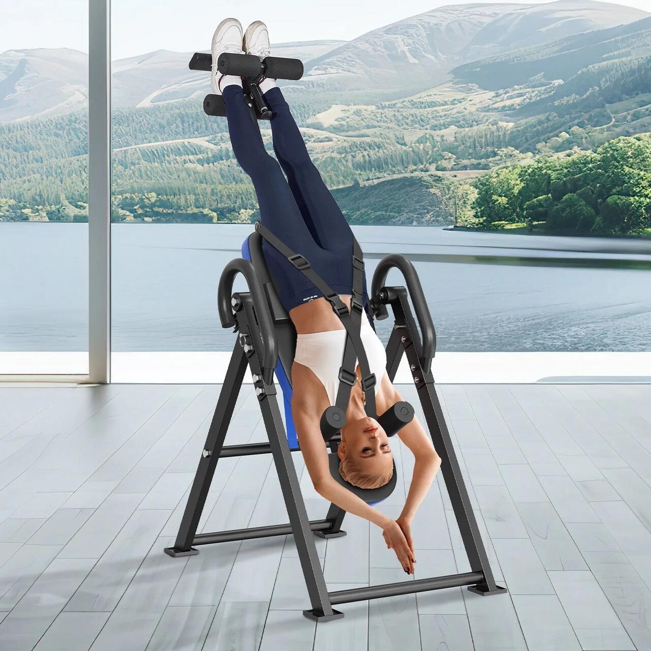 Securitate si confort imbunatatite: Centurile de siguranta duble ale mesei noastre de inversie ofera fixare in mai multe puncte, ajutand corpul sa se relaxeze in pozitia inversata. Rolele detasabile pentru umeri distribuie stresul departe de picioare, facand statul in maini mai usor si mai sigur.