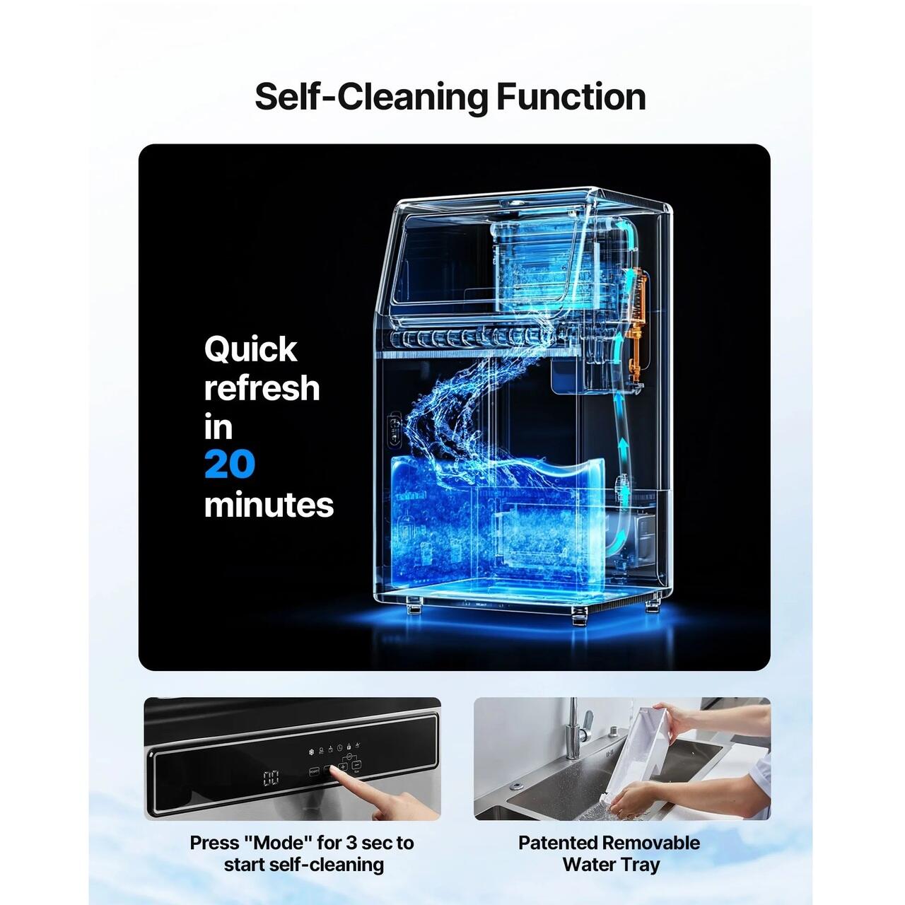 Usor de curatat: Acest aparat de gheata cu autocuratare ruleaza un ciclu de clatire automata de 20 de minute cu o apasare de 3 secunde a butonului „Mod”. Tava de apa detasabila patentata va permite sa ridicati si sa clatiti pentru o curatare profunda si temeinica - atat in interior, cat si in exterior.