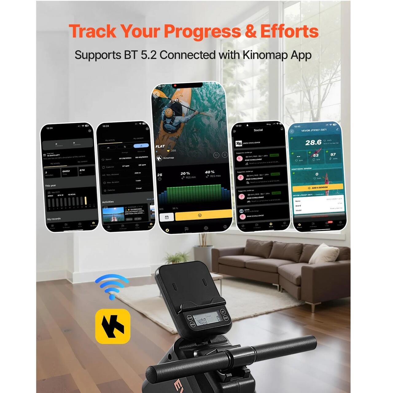 Bluetooth BT 5.0 si urmarire in timp real: Aparatul de vaslit magnetic este compatibil cu Kinomap prin conexiunea BT 5.2, pentru un antrenament virtual captivant care va permite sa ramaneti motivati si sa urmariti zilnic si sa salvati istoricul antrenamentelor pentru a vedea progresul si a ramane motivati la fiecare sesiune.