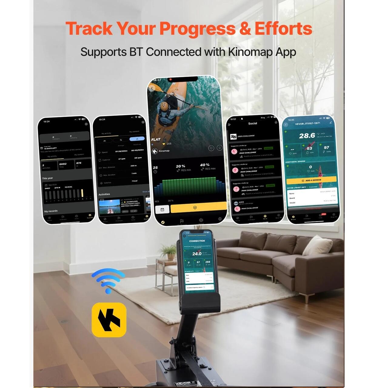 Conexiune BT si urmarire in timp real: Aparatul de vaslit este compatibil cu Kinomap prin conexiune BT, pentru un antrenament virtual captivant, care va permite sa ramaneti motivati si sa urmariti zilnic si sa salvati istoricul antrenamentelor pentru a vedea progresul si a ramane motivati la fiecare sesiune.