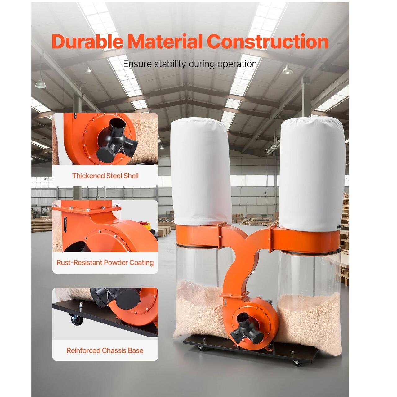 Design durabil al motorului: Colectorul nostru de praf cu con vortex este dotat cu un motor fara perii de inalta performanta de 3,0 CP, care mentine o aspiratie constanta in timp ce functioneaza la ≤90dB. Structura sa rezistenta la supraincarcare prelungeste durata de viata a motorului, oferind un flux de aer constant pentru indepartarea eficienta a prafului si un flux de lucru neintrerupt in atelier.