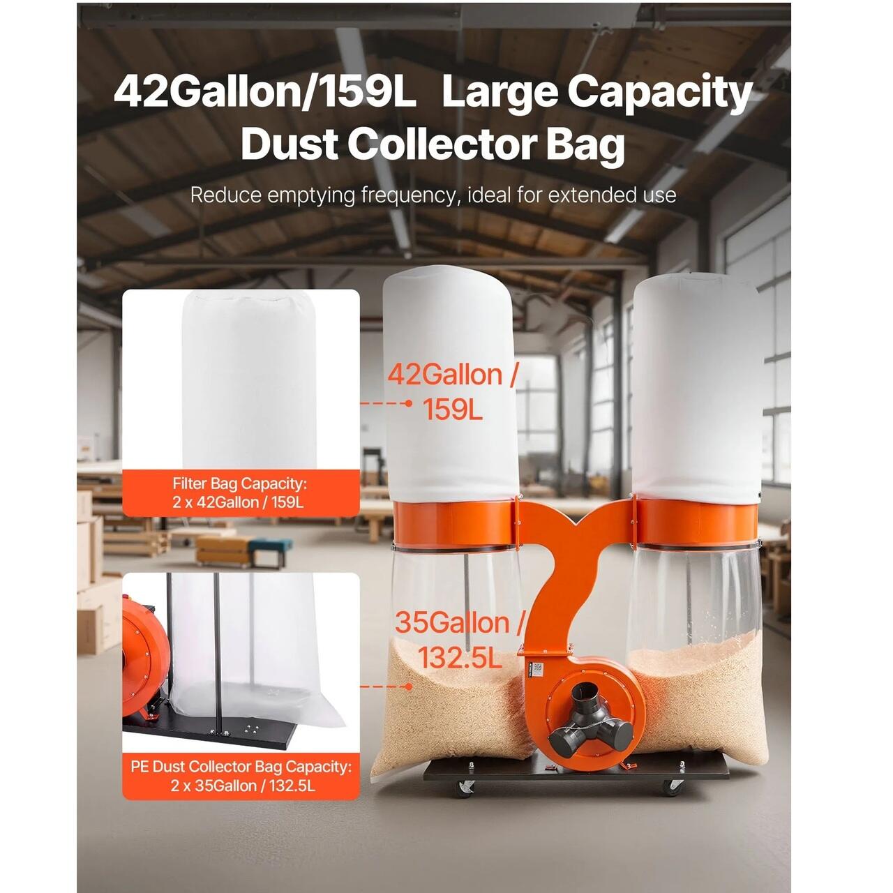 Capacitate ampla de stocare a prafului: Dotat cu doua saci mari din material netesut, de 159 l acest sistem de colectare a prafului pentru atelierul de tamplarie permite o functionare continua mai lunga, cu mai putine opriri. Gestioneaza eficient praful si resturile provenite din sarcinile de prelucrare a lemnului de dimensiuni medii si mici, economisind timp si crescand productivitatea generala a atelierului.