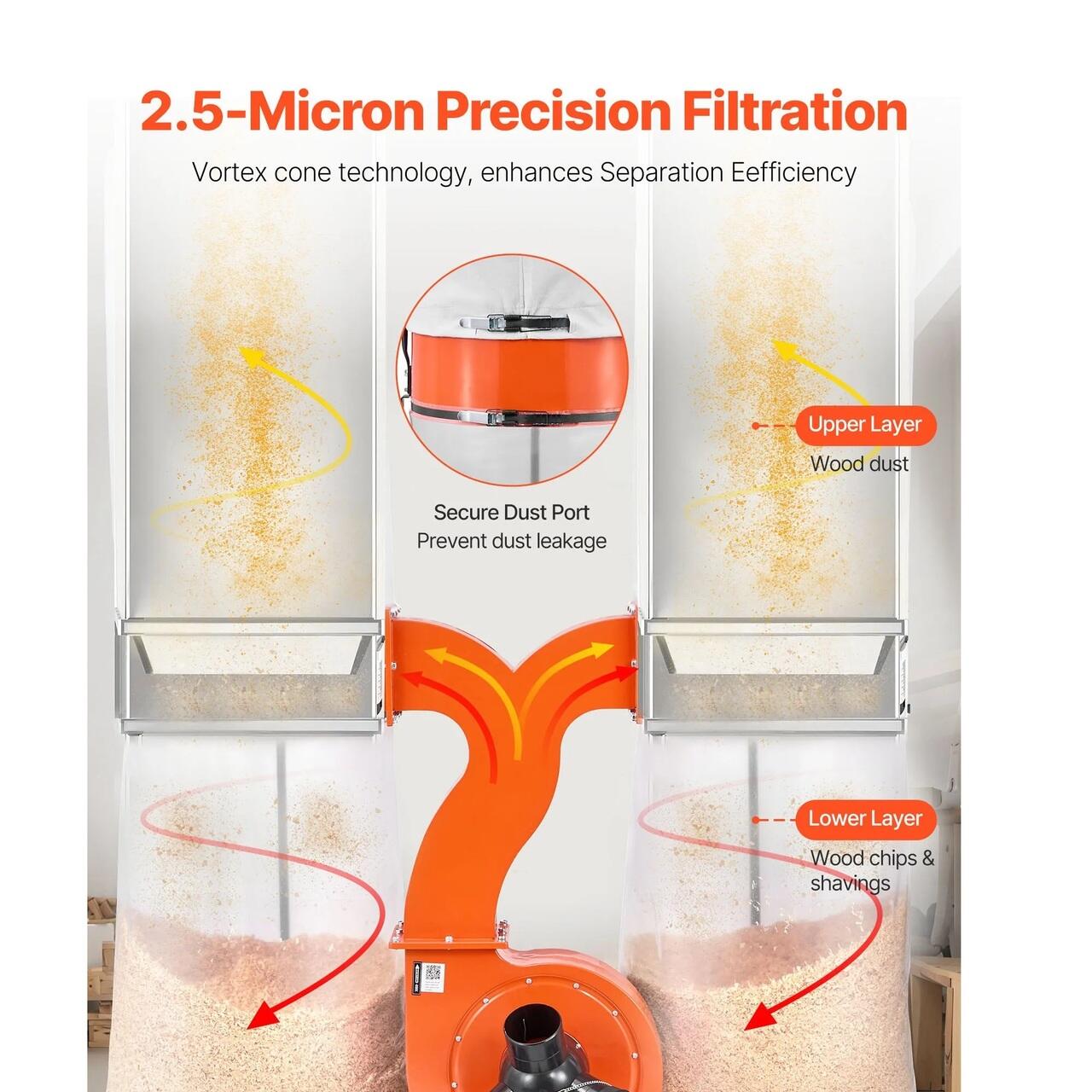 Filtrare precisa a aerului: Cu o filtrare de 2,5 microni, acest sistem de colectare a prafului pentru prelucrarea lemnului capteaza eficient praful fin de lemn, aschiile si particulele. Reduce contaminantii din aer, mentine un aer mai curat si reduce expunerea la praf, sustinand un mediu de prelucrare a lemnului mai eficient si mai confortabil.