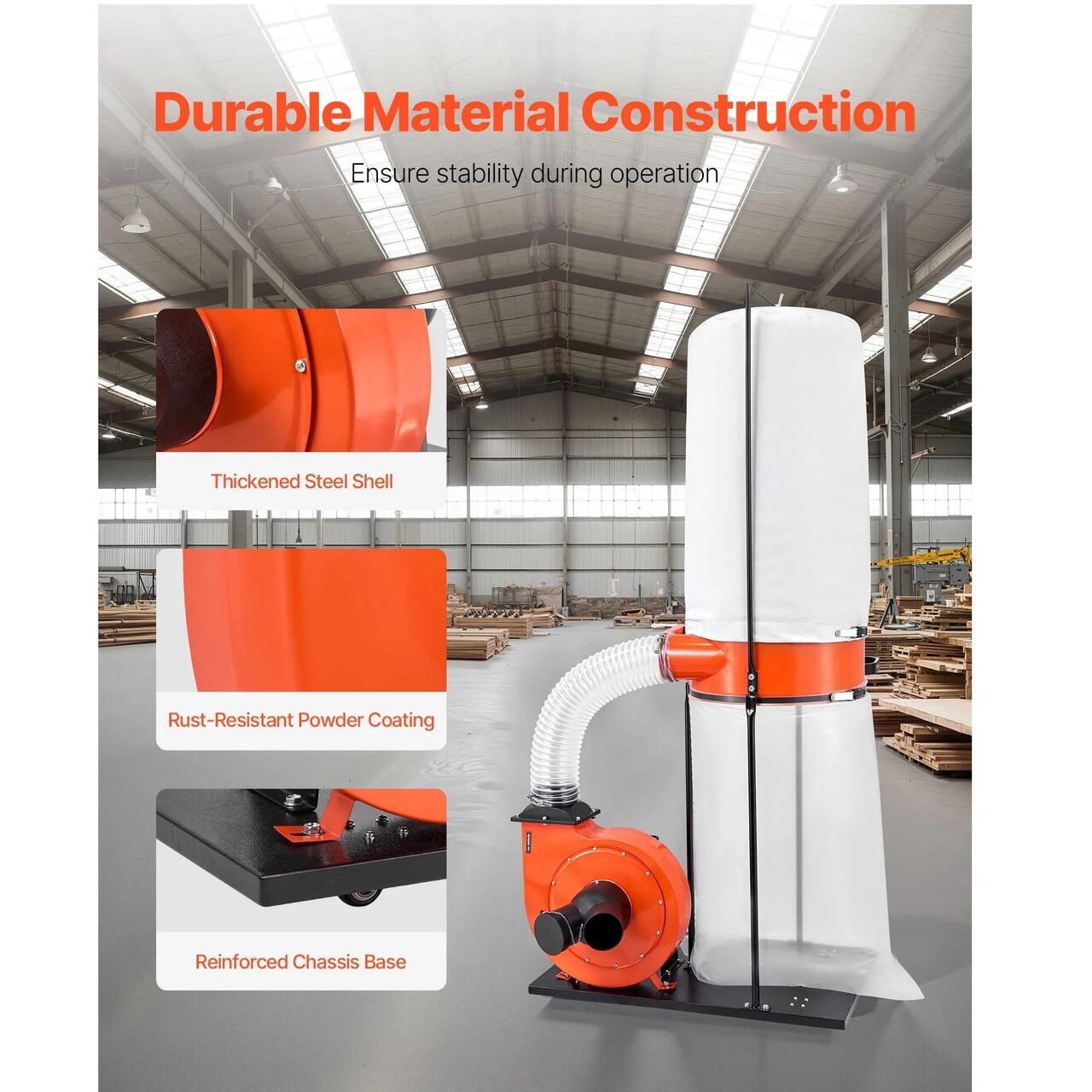 Aspirare robusta a prafului: Cu un flux de aer de 1200 CFM, acest colector de praf portabil Vortex capteaza particulele de lemn mari si fine deopotriva. Aspirarea rapida si puternica curata eficient spatiul de lucru, imbunatateste calitatea generala a aerului din atelier si permite sesiuni de prelucrare a lemnului mai productive si fara probleme.