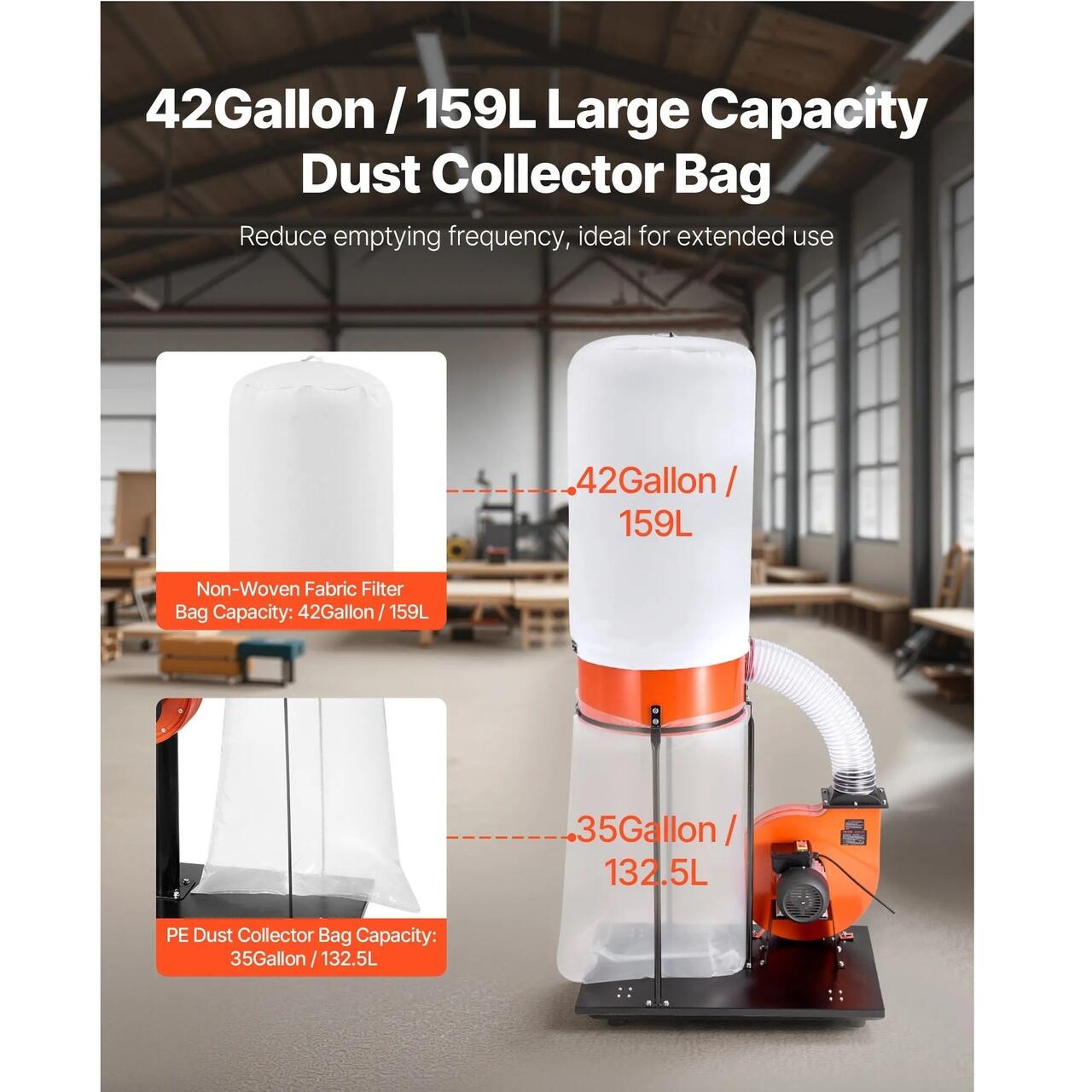 Colectare de volum mare: Acest sistem de colectare a prafului pentru atelierul de tamplarie are o capacitate de 159 l si poate gazdui mai mult rumegus si resturi per sesiune. Conceput pentru proiecte de prelucrare a lemnului de dimensiuni medii si mici, reduce golirea frecventa, simplifica fluxul de lucru si imbunatateste eficienta pe parcursul sarcinilor din atelier.