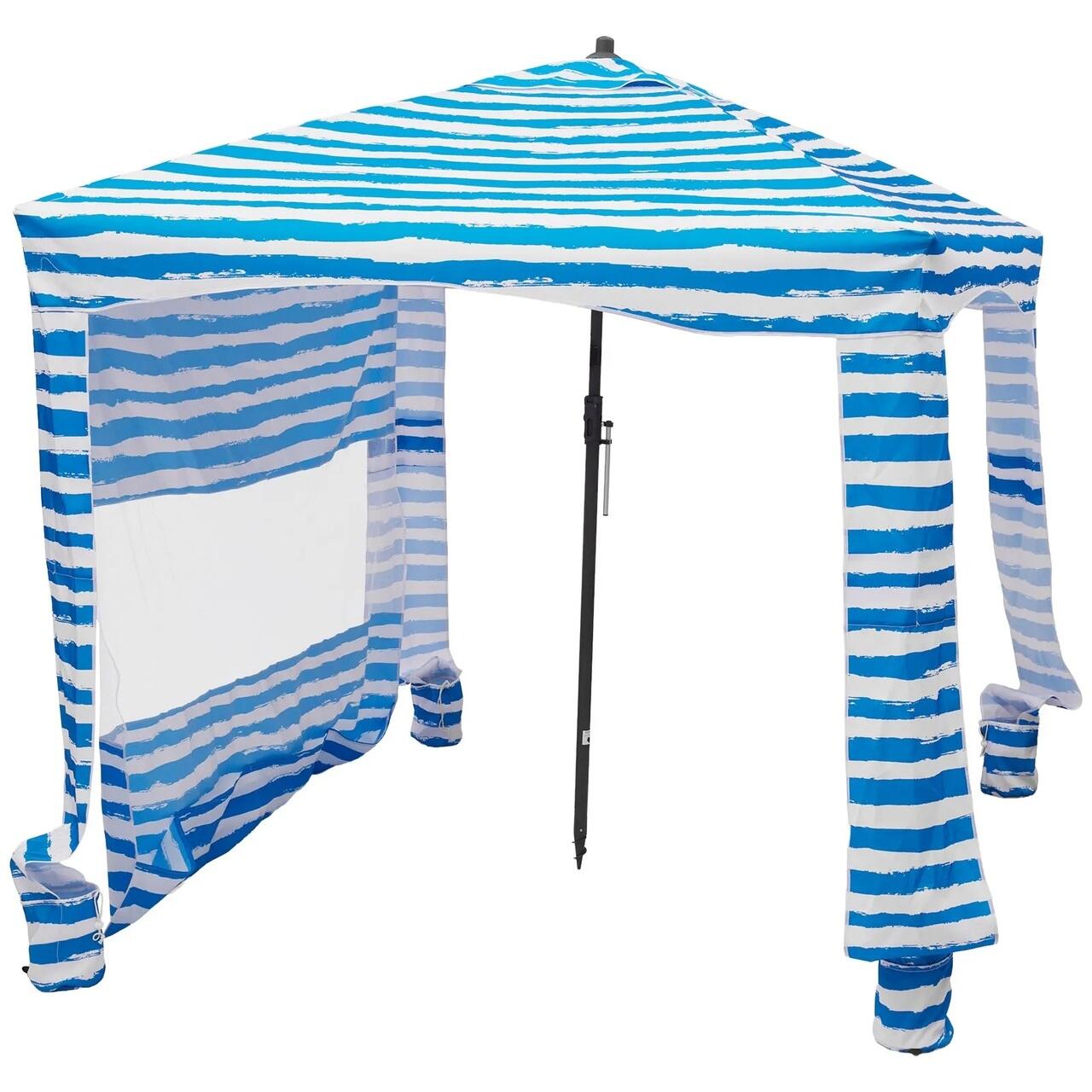 Pavilion gradina/plaja, Portabil 183x183 cm, 1 x perete lateral, Alb/Albastru, Protecție solara UPF 50+, Geanta