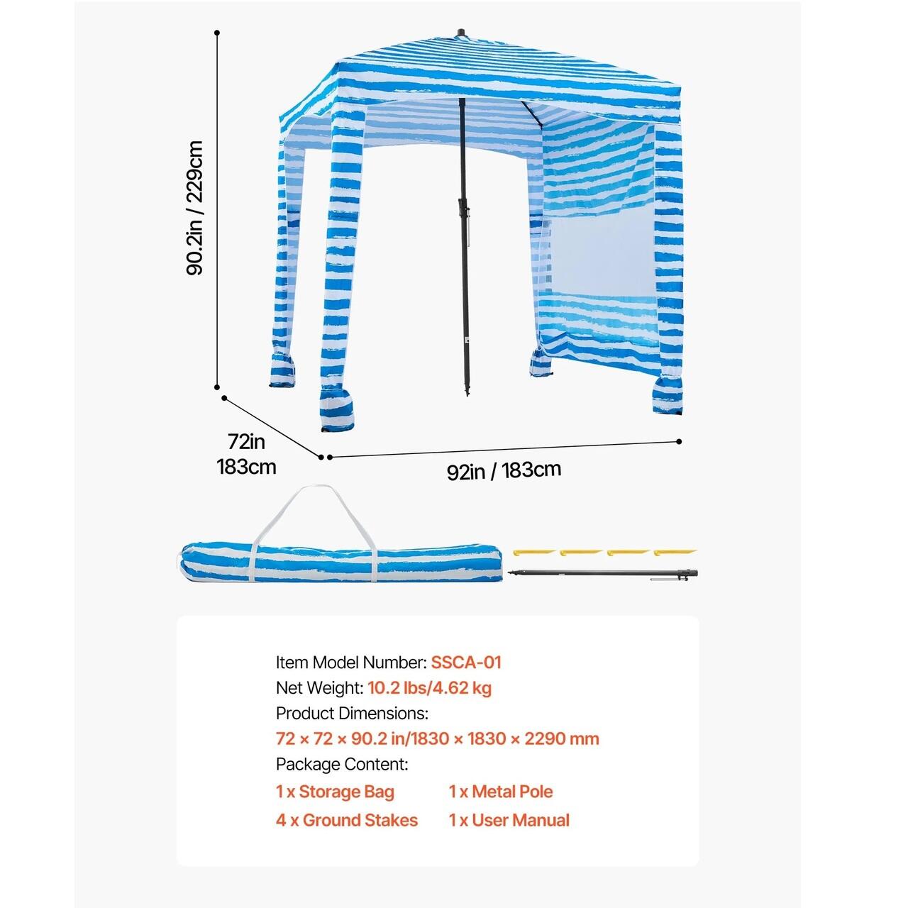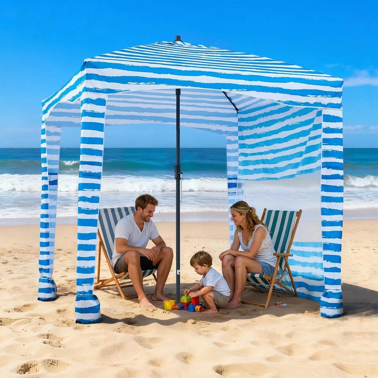 Cabana de plaja de 1,8 x 1,8 m: Aceasta cabana de plaja spatioasa, cu perdea laterala, poate gazdui confortabil doua persoane, scaune si echipament. Proiectata cu buzunare de depozitare, aceasta pastreaza telefoanele, ochelarii de soare si crema de protectie solara la indemana.