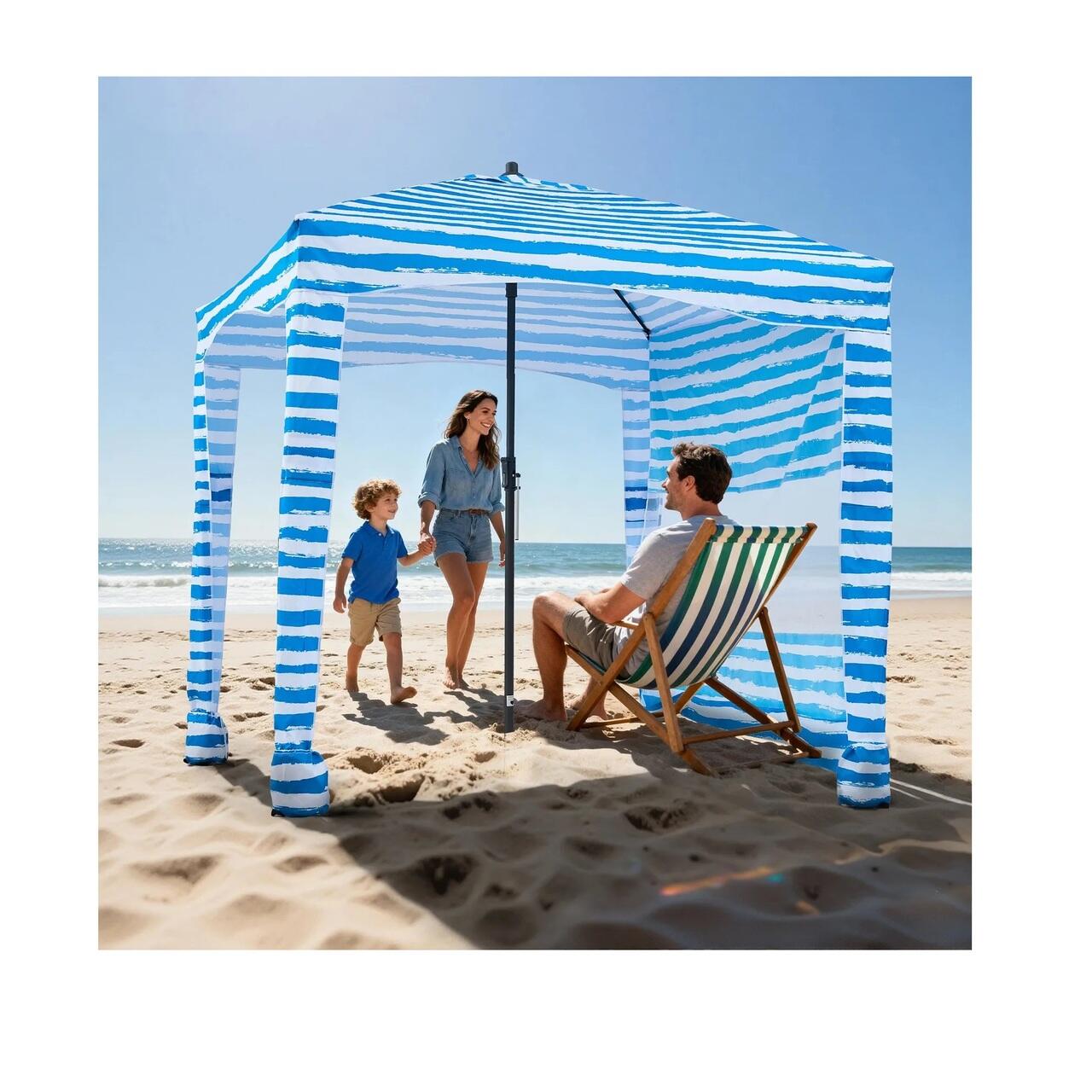 Rezistenta la vant: Echipata cu un cadru robust din fibra de sticla, un stalp principal cu suruburi, saci de nisip si tarusi de pamant, aceasta cabana mare de plaja ramane ferm ancorata in nisip. Rezista la prabusire sau la vant, chiar si sub briza usoara a marii.