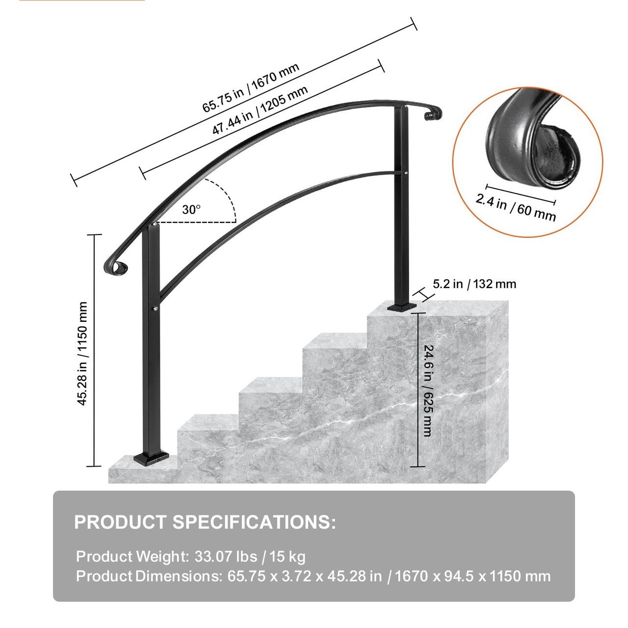 Flexibil pentru 5 trepte: Inaltimea maxima pentru trepte: 62,5 cm; Distanta dintre stalpi: 120,5 cm; Inaltimea stalpului superior: 97 cm; Inaltimea stalpului inferior: 106 cm. Datorita inaltimii flexibile, balustrada noastra din fier forjat se potriveste celor 5 trepte ale dvs. in functie de diferitele dimensiuni. Este perfecta pentru a ajuta oamenii sa isi mentina echilibrul in ploaie sau iarna si pentru a preveni derapajele.