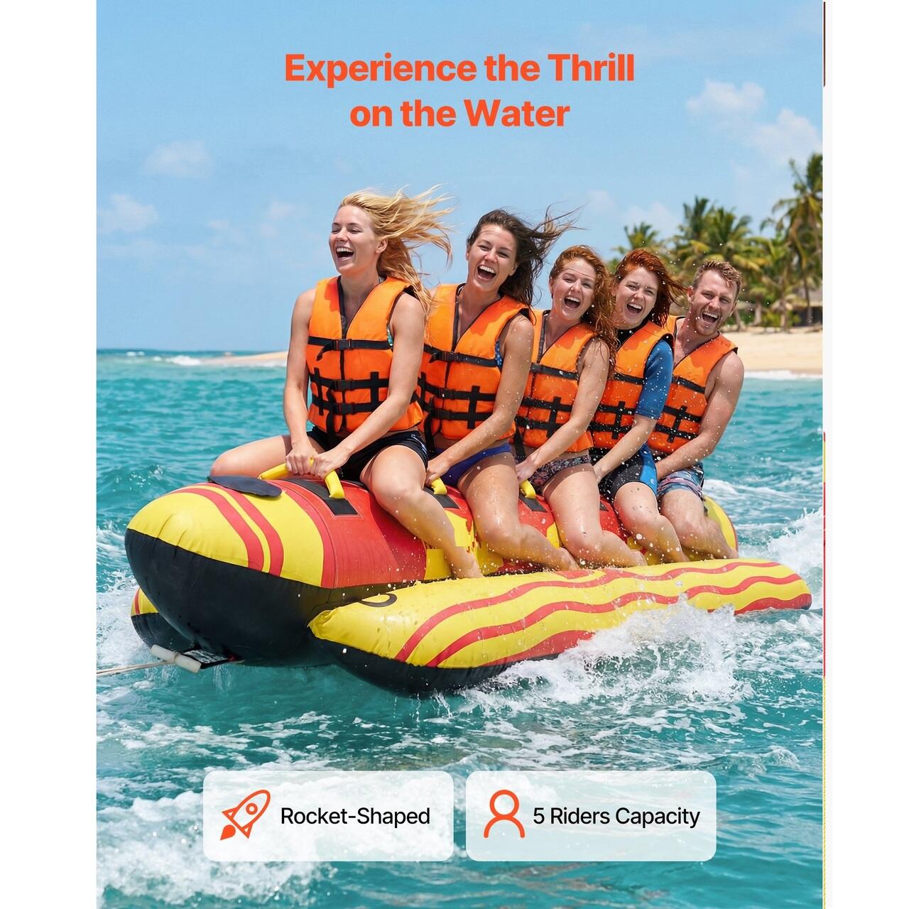 Distractie nautica palpitanta: Proiectata in forma de racheta, aceasta barca remorcabila pentru navigatie dispune de geamanduri laterale care sporesc stabilitatea si ofera suport pentru genunchi. Poate gazdui pana la 5 persoane cu o capacitate maxima de 385 kg pentru distractie nautica plina de senzatii tari.