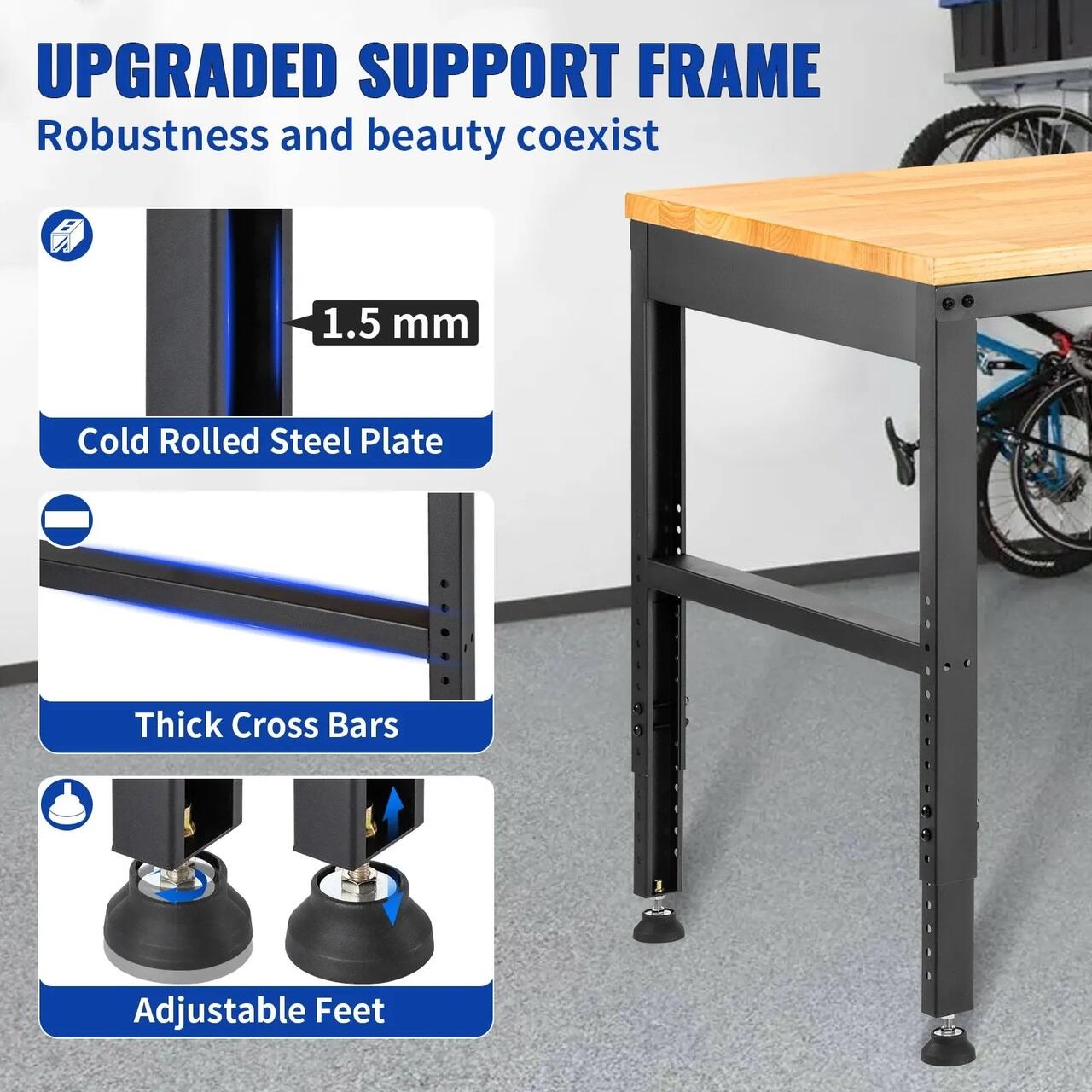 Constructie stabila si instalare accesibila: Cadrul mesei de lucru este realizat din placi de otel laminate la rece, care sunt foarte rezistente. Mai multe bare transversale groase mentin masa stabila atunci cand este incarcata. Intre timp, bancul de lucru reglabil este echipat cu 4 picioare de cauciuc, impiedicandu-l efectiv sa alunece si protejand podeaua. In plus, toate accesoriile, uneltele necesare si instructiunile detaliate de instalare sunt incluse, ceea ce face usoara asamblarea bancului de lucru rezistent.