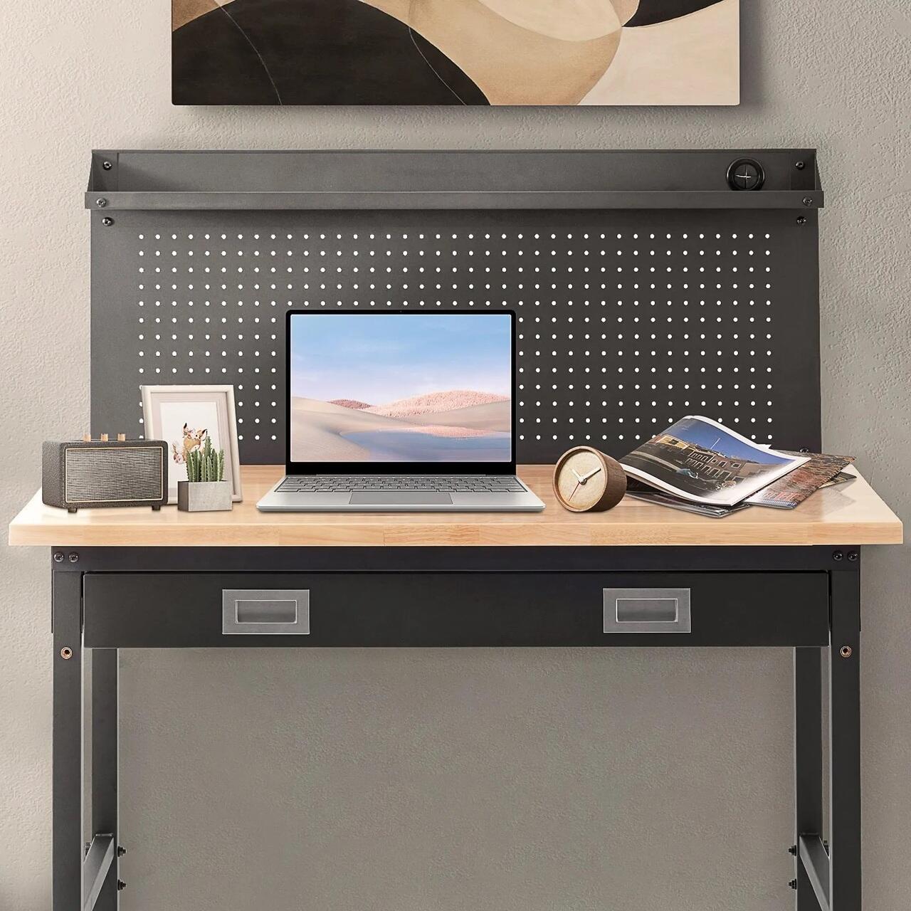 Constructie stabila din lemn masiv: Fabricata din otel carbon rezistent, banca noastra de lucru dispune de o suprafata de lucru din lemn masiv si de mai multe traverse, asigurand o structura stabila care va mentine concentrati si stabili. Spuneti adio oscilatiilor si distragerilor si lucrati cu incredere.