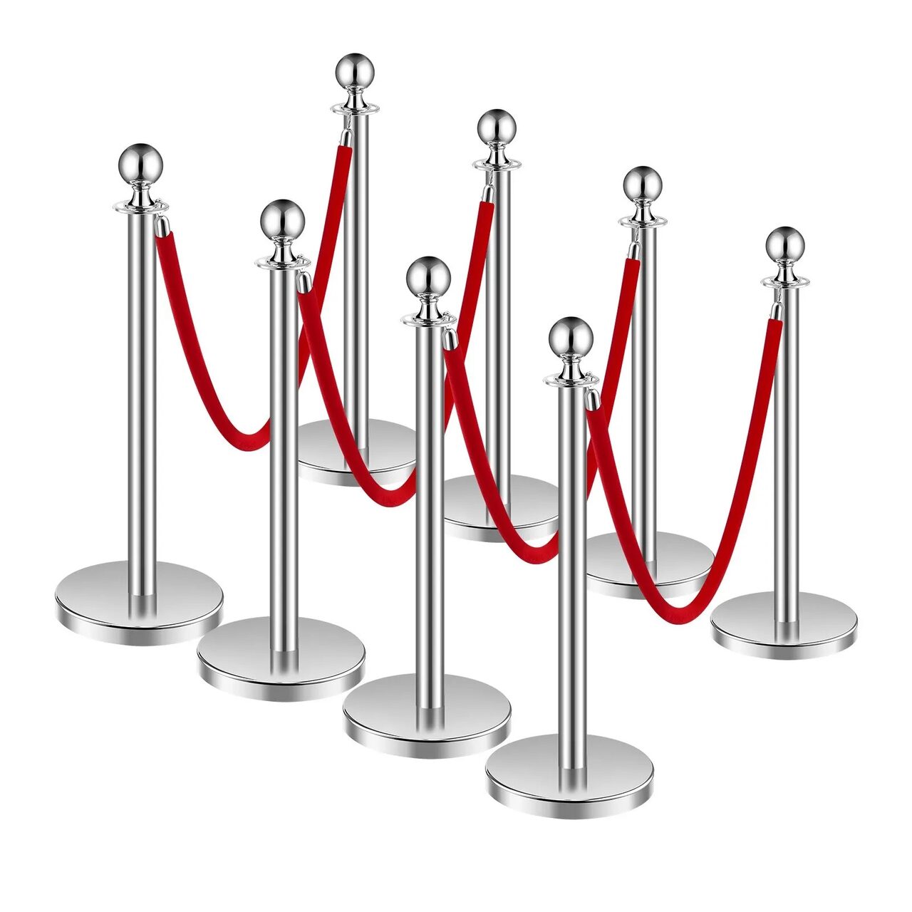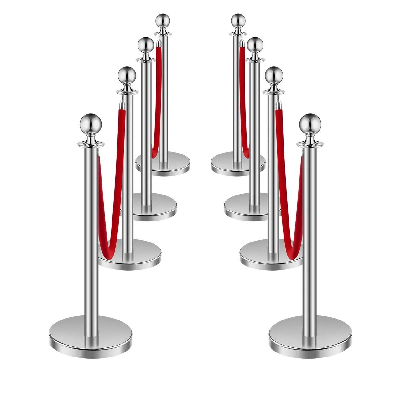 Set 8 stalpi delimitare, 4 x Franghie rosie 1.5 m, Inox, Argintiu, Inaltime 90 cm