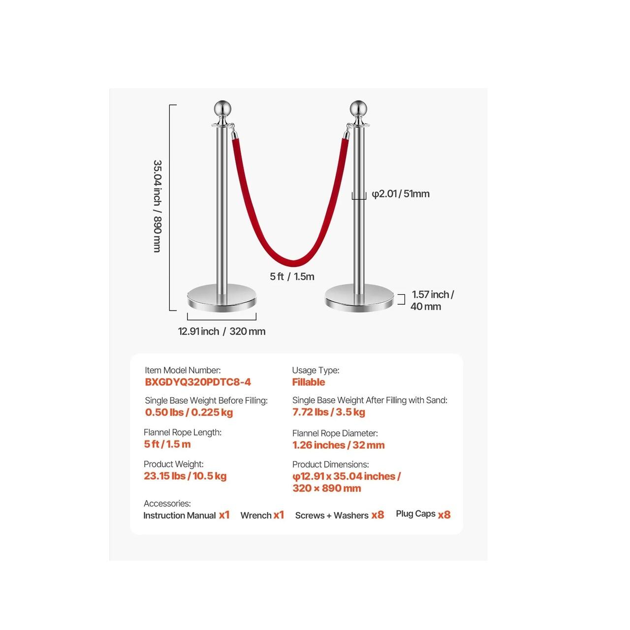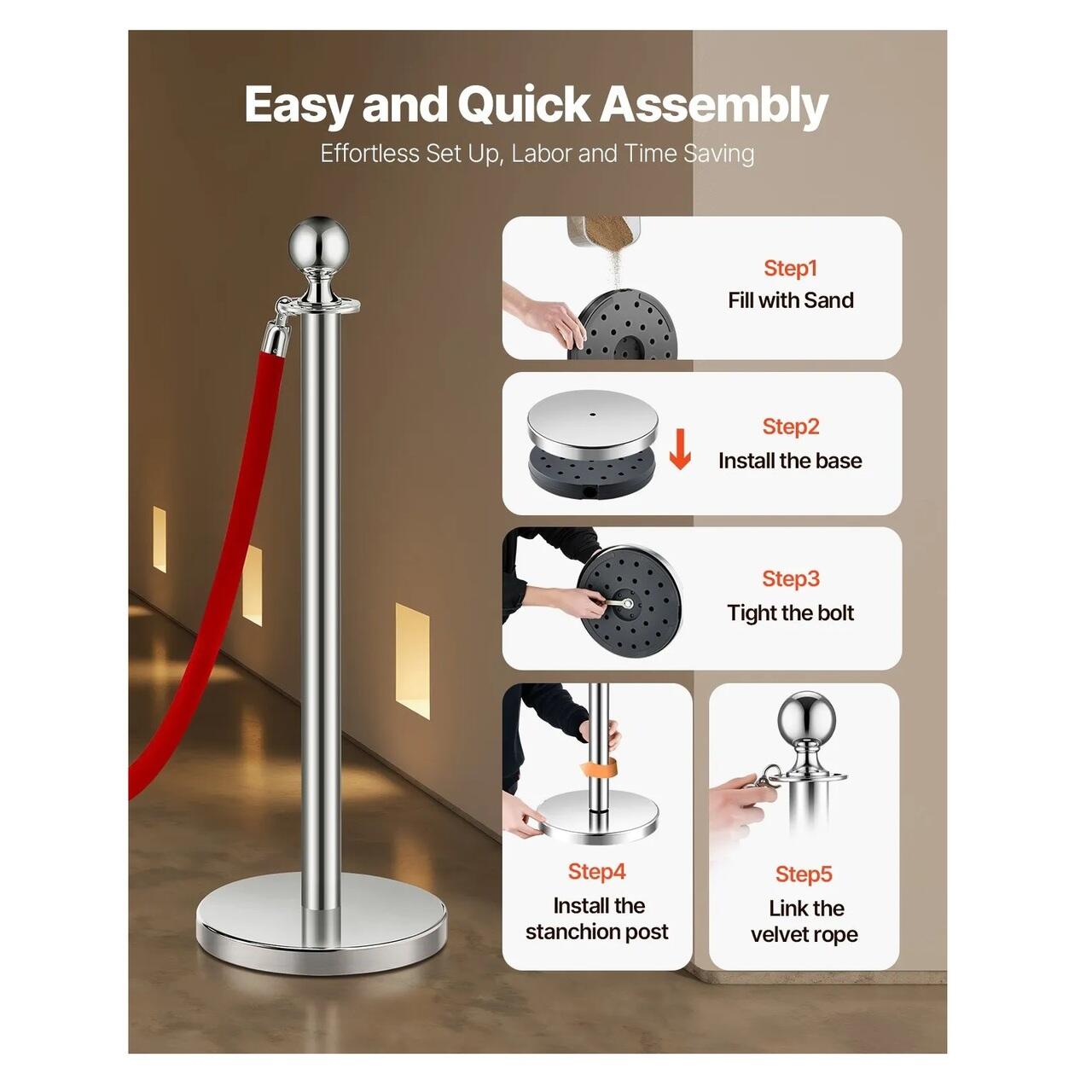 Asamblare rapida: Nu necesita unelte! Pur si simplu insurubati baza la locul ei, umpleti-o cu nisip si sistemul dvs. de control al multimii din franghie de catifea este gata de utilizare. Usor de instalat si chiar mai usor de utilizat oricand aveti nevoie.
