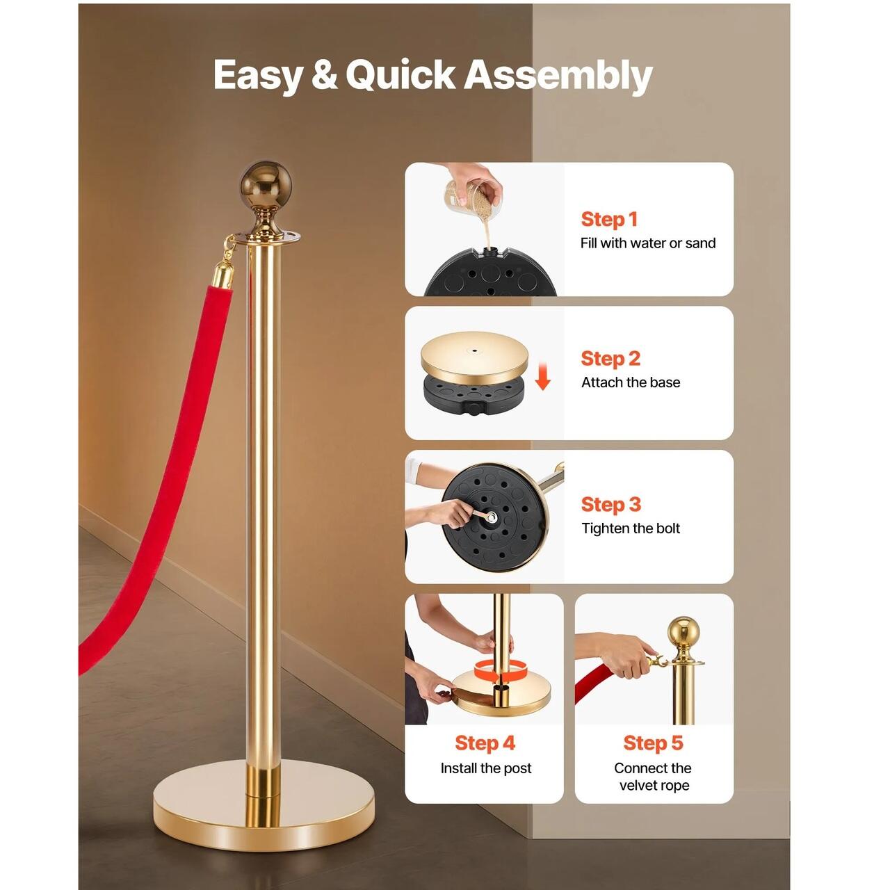 Asamblare rapida: Nu necesita unelte! Pur si simplu umpleti aceasta coada de stalpi cu nisip/apa si insurubati baza la locul ei, iar franghiile si suporturile de catifea sunt gata de utilizare. Usor de instalat si chiar mai usor de utilizat oricand aveti nevoie.