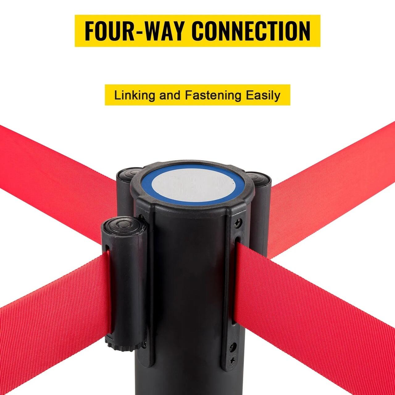 Set 6 stalpi delimitare, Banda rosie retractabila in 4 directii, Otel carbon, Negru, Inaltime 90 cm, Lungime curea 2 m