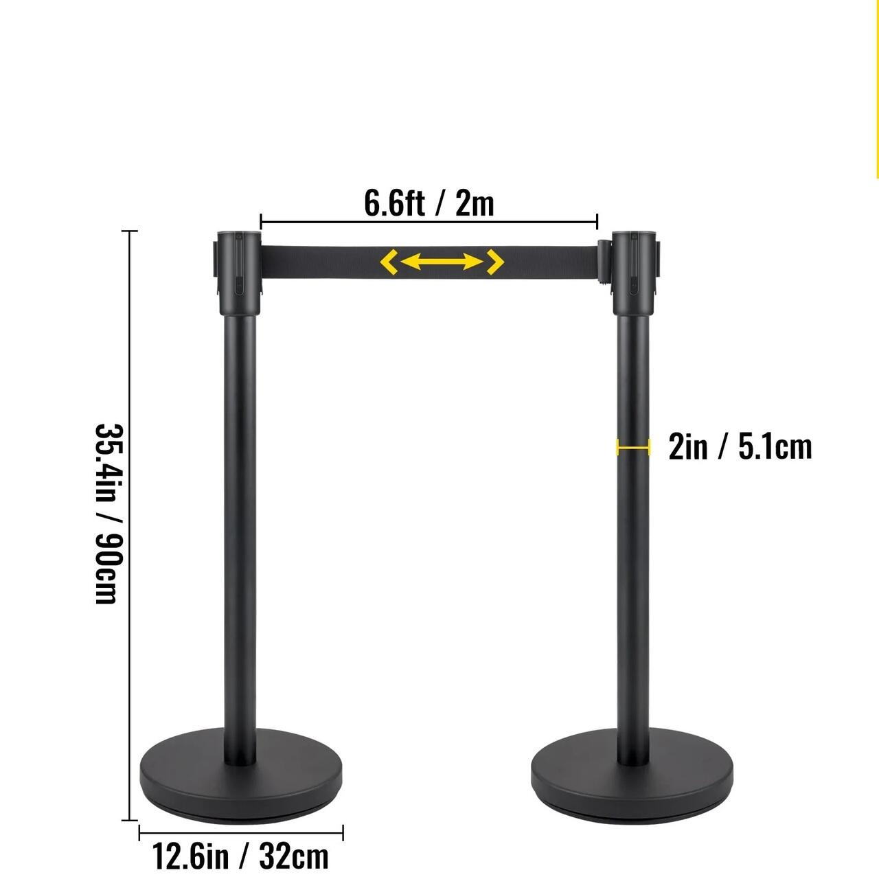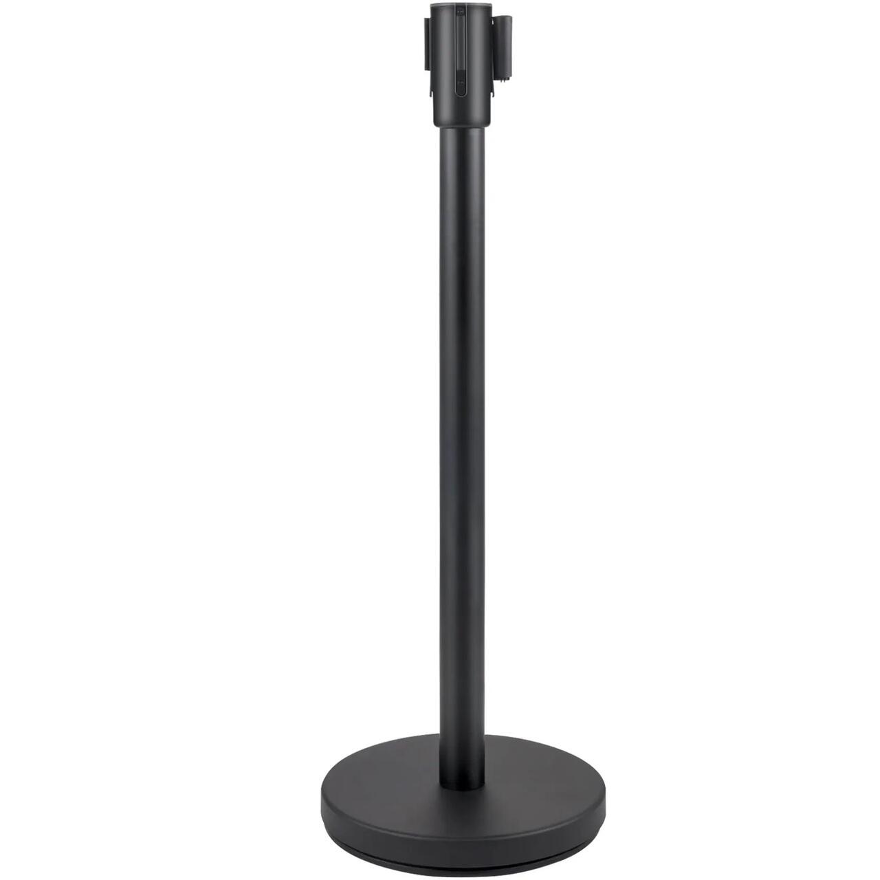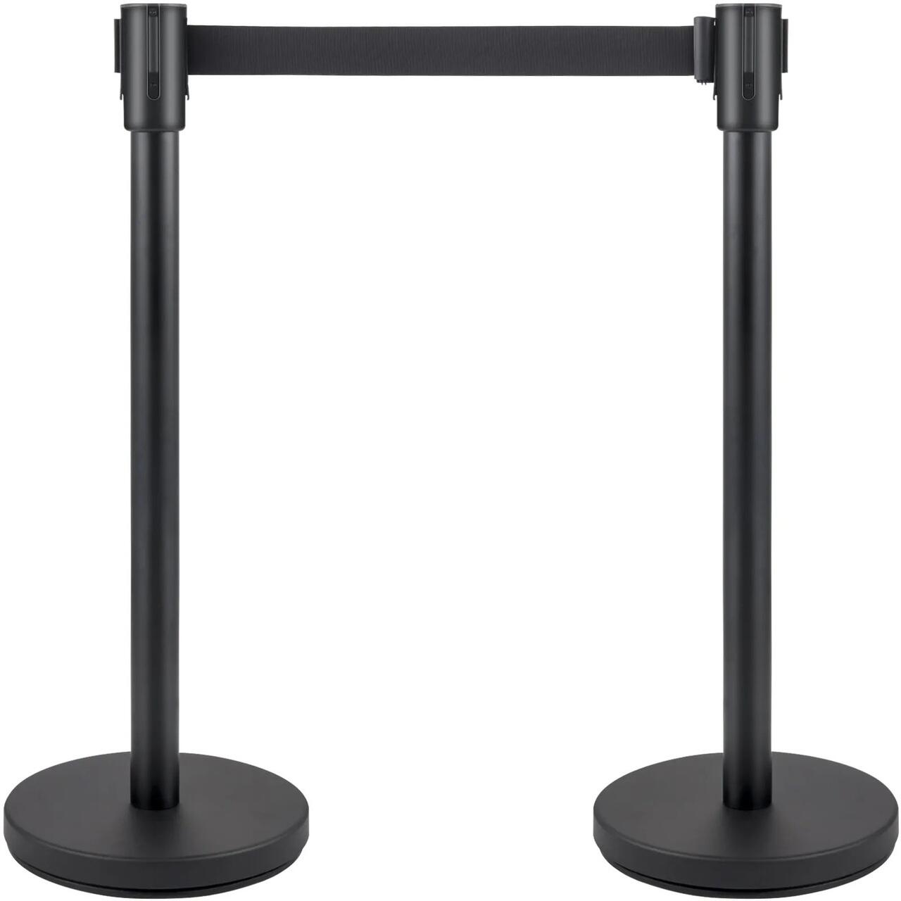 Set 6 stalpi delimitare, Banda Neagra retractabila in 4 directii, Otel carbon, Negru, Inaltime 90 cm, Lungime curea 2 m
