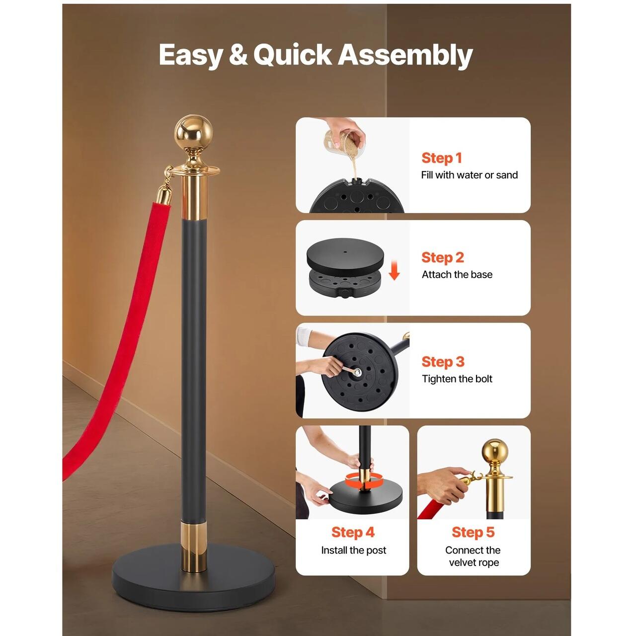 Asamblare rapida: Nu necesita unelte! Pur si simplu umpleti aceasta coada de stalpi cu nisip/apa si insurubati baza la locul ei, iar franghiile si suporturile de catifea sunt gata de utilizare. Usor de instalat si chiar mai usor de utilizat oricand aveti nevoie.