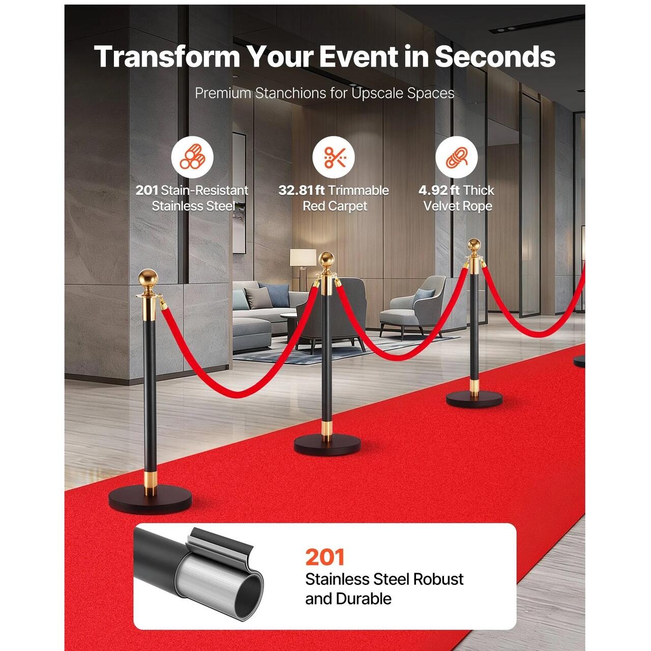 Stalpi premium din franghie de catifea: Construiti cu stalpi robusti din otel inoxidabil 201, stalpul nostru cu franghii groase de catifea si un finisaj metalic rafinat asigura o ghidare fiabila a multimii, ridicand instantaneu intrarea dvs. cu un aspect ceremonial de inalta calitate.