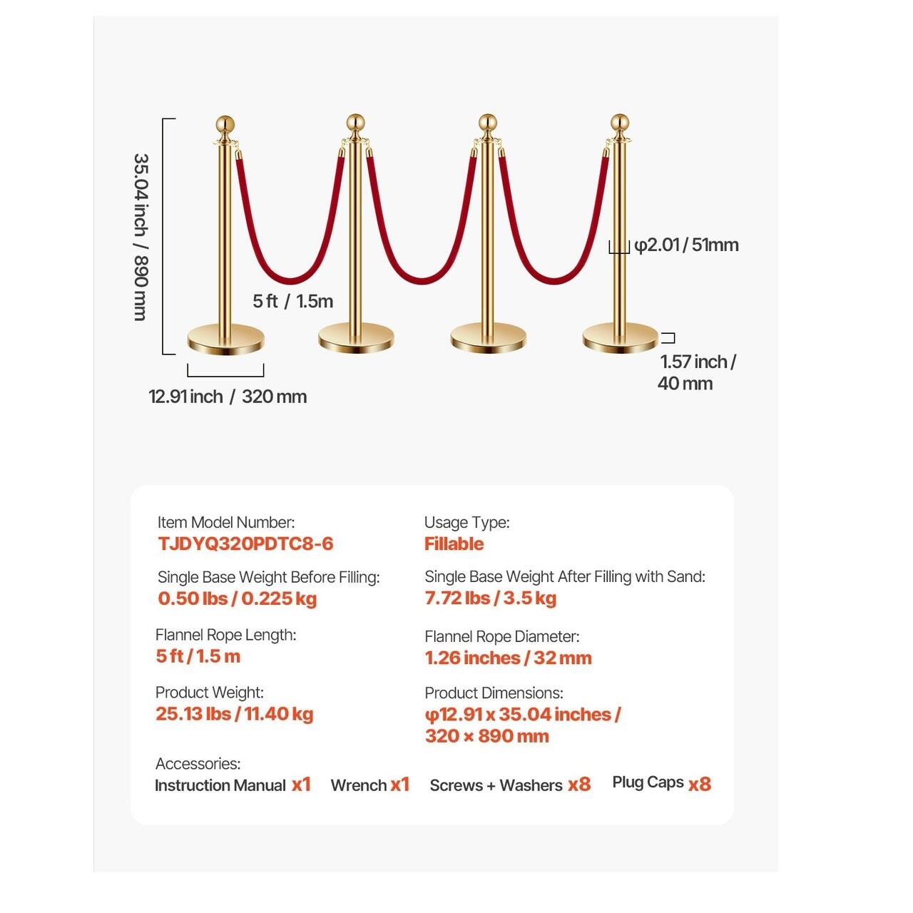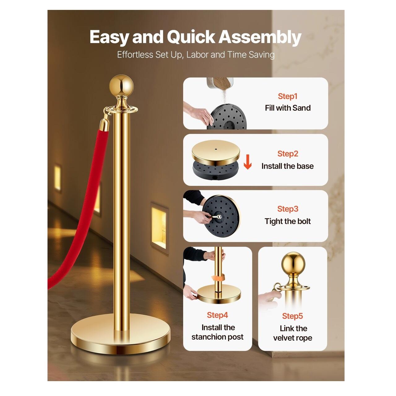 Asamblare rapida: Nu necesita unelte! Pur si simplu insurubati baza la locul ei, umpleti-o cu nisip si sistemul dvs. de control al multimii din franghie de catifea este gata de utilizare. Usor de instalat si chiar mai usor de utilizat oricand aveti nevoie.