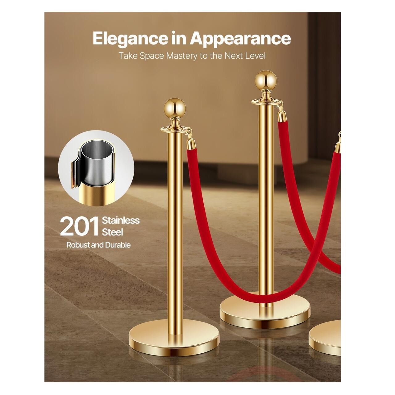 Set 8 stalpi delimitare, 6 x Franghie rosie 1.5 m, Inox, Auriu, Inaltime 90 cm
