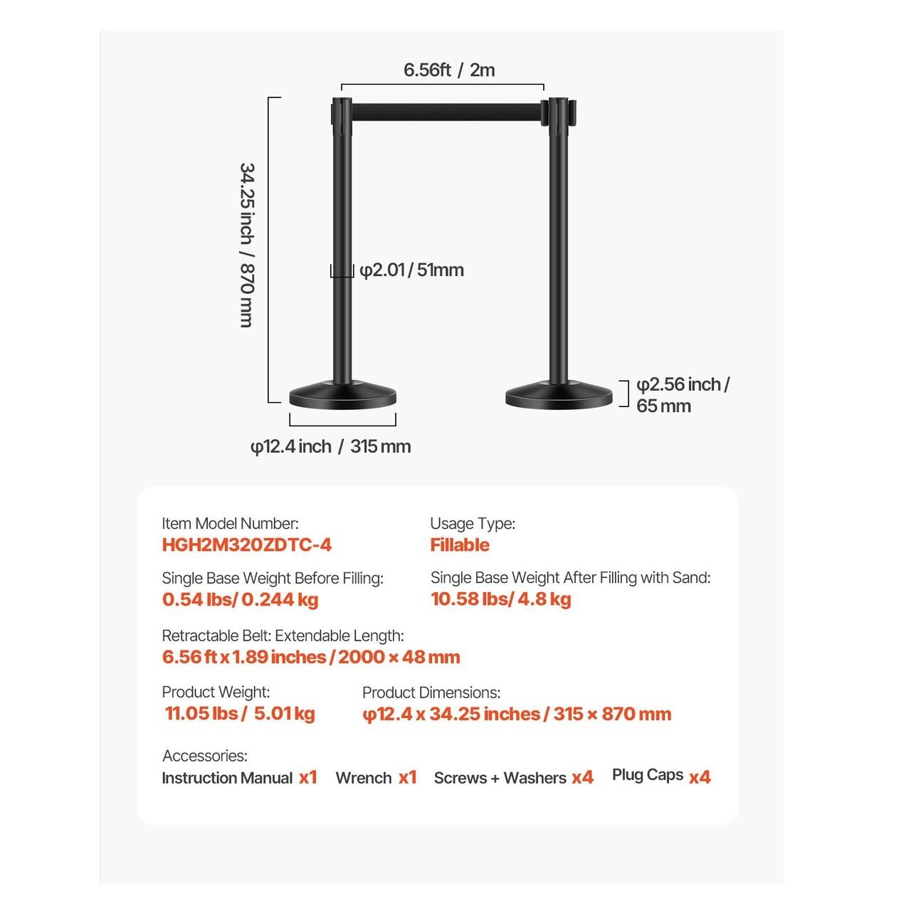 Set 4 stalpi delimitare, Banda retractabila in 4 directii,Otel carbon, Negru, Inaltime 90 cm, Heavy Duty, Lungime curea 2 m