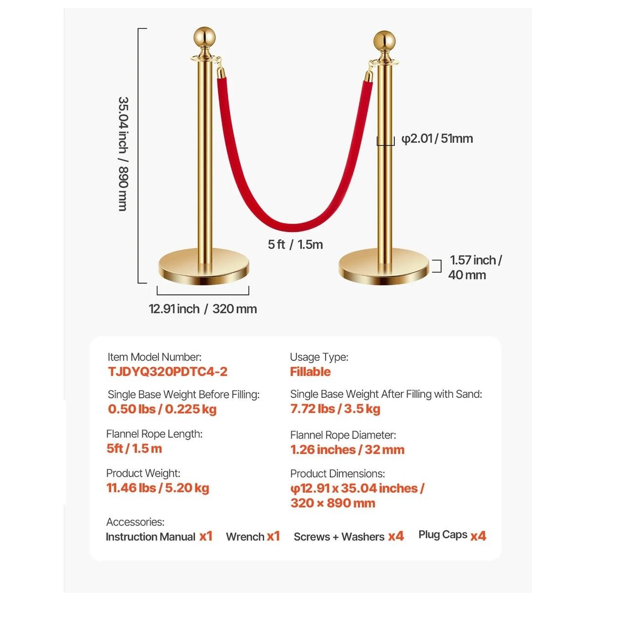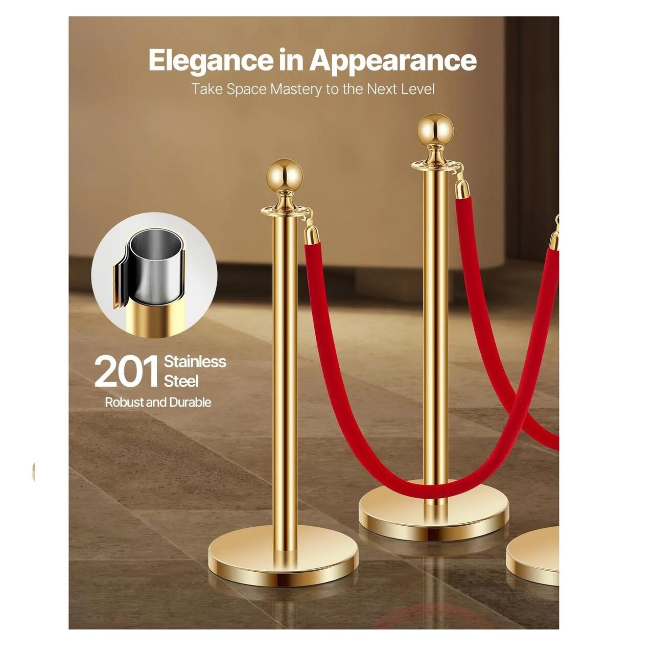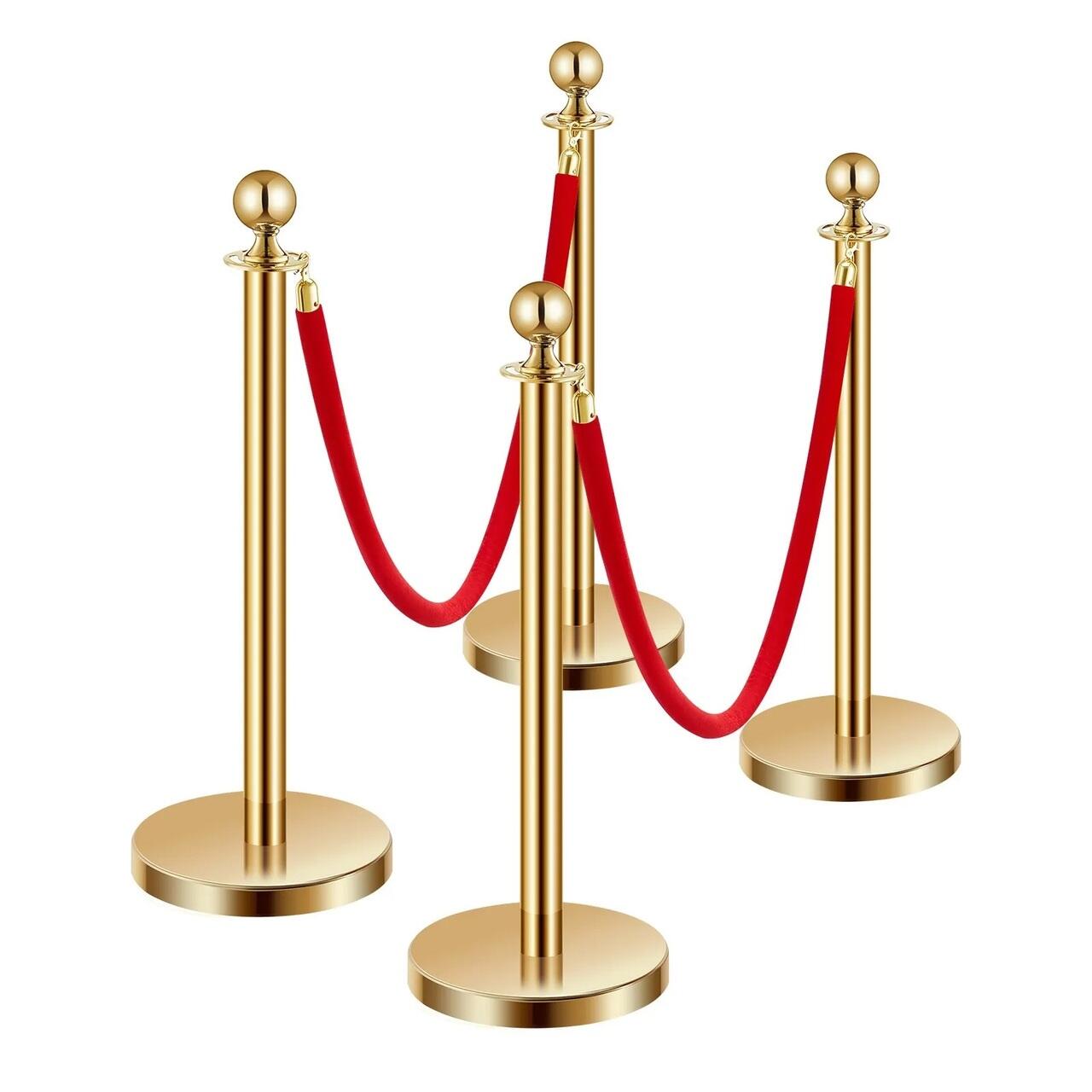 Set 4 stalpi delimitare, 2 x Franghie rosie 1.5 m, Inox, Auriu, Inaltime 90 cm, baza goala