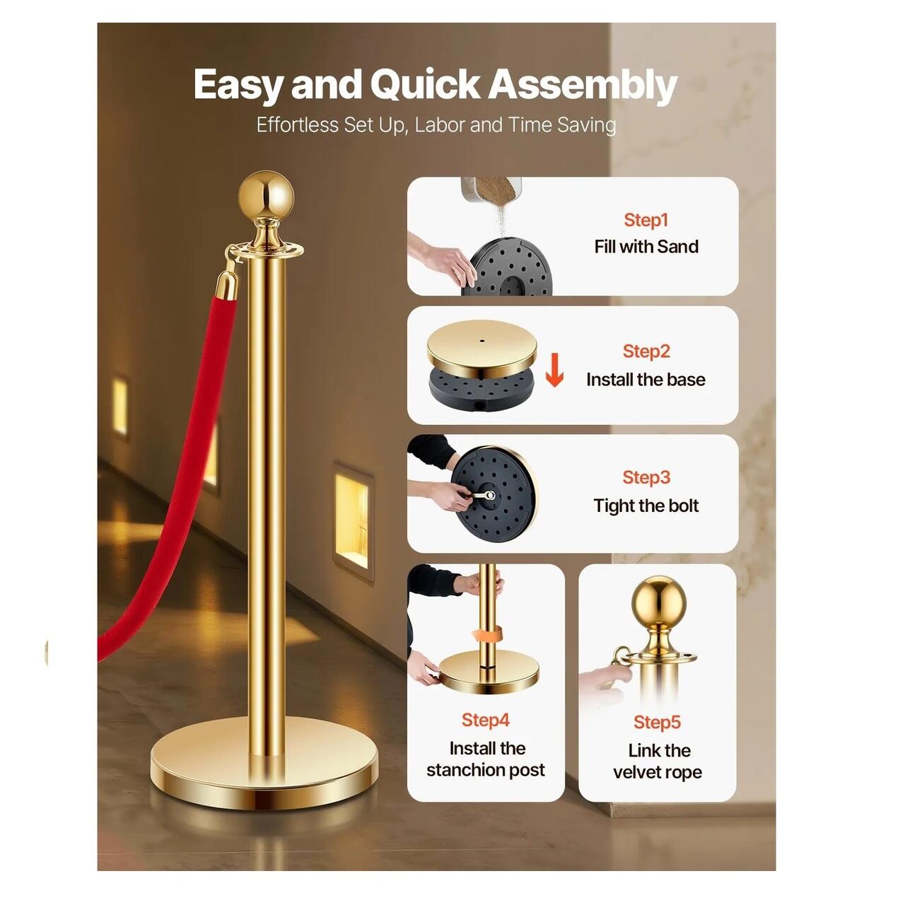 Asamblare rapida: Nu necesita unelte! Pur si simplu insurubati baza la locul ei, umpleti-o cu nisip si sistemul dvs. de control al multimii din franghie de catifea este gata de utilizare. Usor de instalat si chiar mai usor de utilizat oricand aveti nevoie.