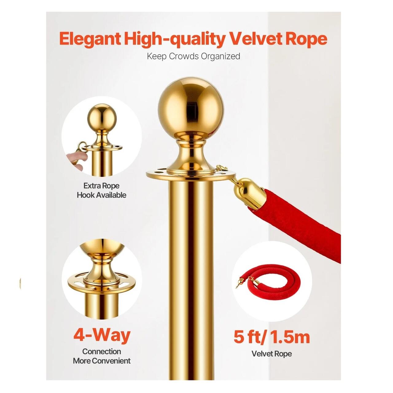 Set 4 stalpi delimitare, 2 x Franghie rosie 1.5 m, Inox, Auriu, Inaltime 96 cm, baza plina