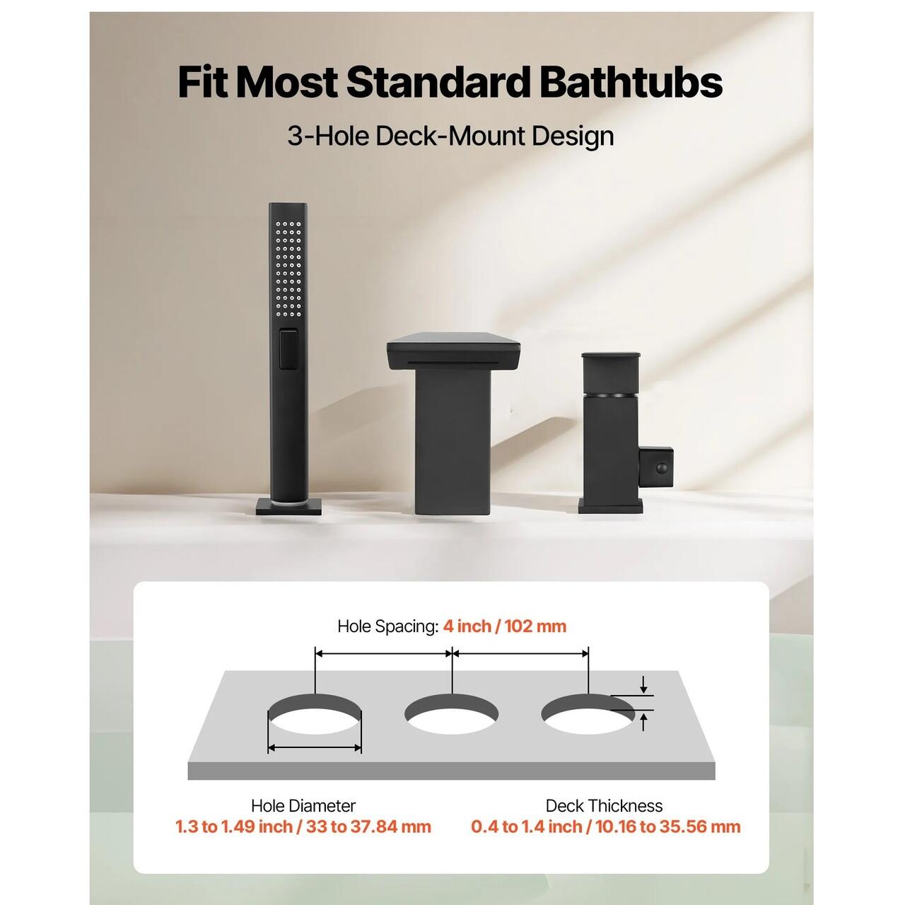 Configuratie montare pe terasa: Aceasta baterie pentru cada romana foloseste o instalare pe terasa cu 3 gauri, potrivindu-se majoritatii cazilor standard. Designul permite montarea gaurilor cu diametrul de la 33 la 37,84 mm si grosimile terasa intre 10,16 si 35,56 mm, oferind flexibilitate in timpul modernizarii locuintei.