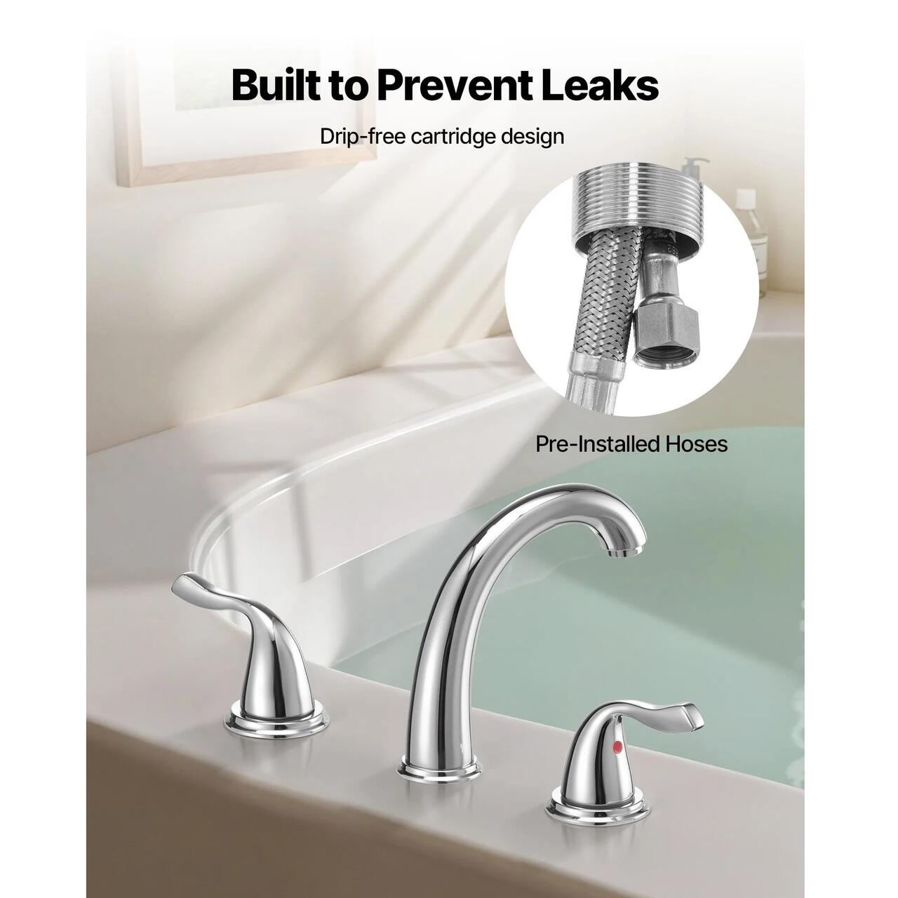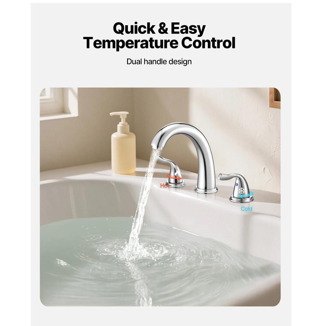 Instalare cu 3 gauri: Echipat cu un design de instalare pe terasa cu 3 gauri, acest robinet de cada cu montare pe terasa este perfect pentru majoritatea cazilor de baie. Cu un diametru al gaurii de 31-35,81 mm si o grosime a chiuvetei de 10,16 pana la 35,56 mm, instalarea este rapida si simpla, oferind un confort sporit.