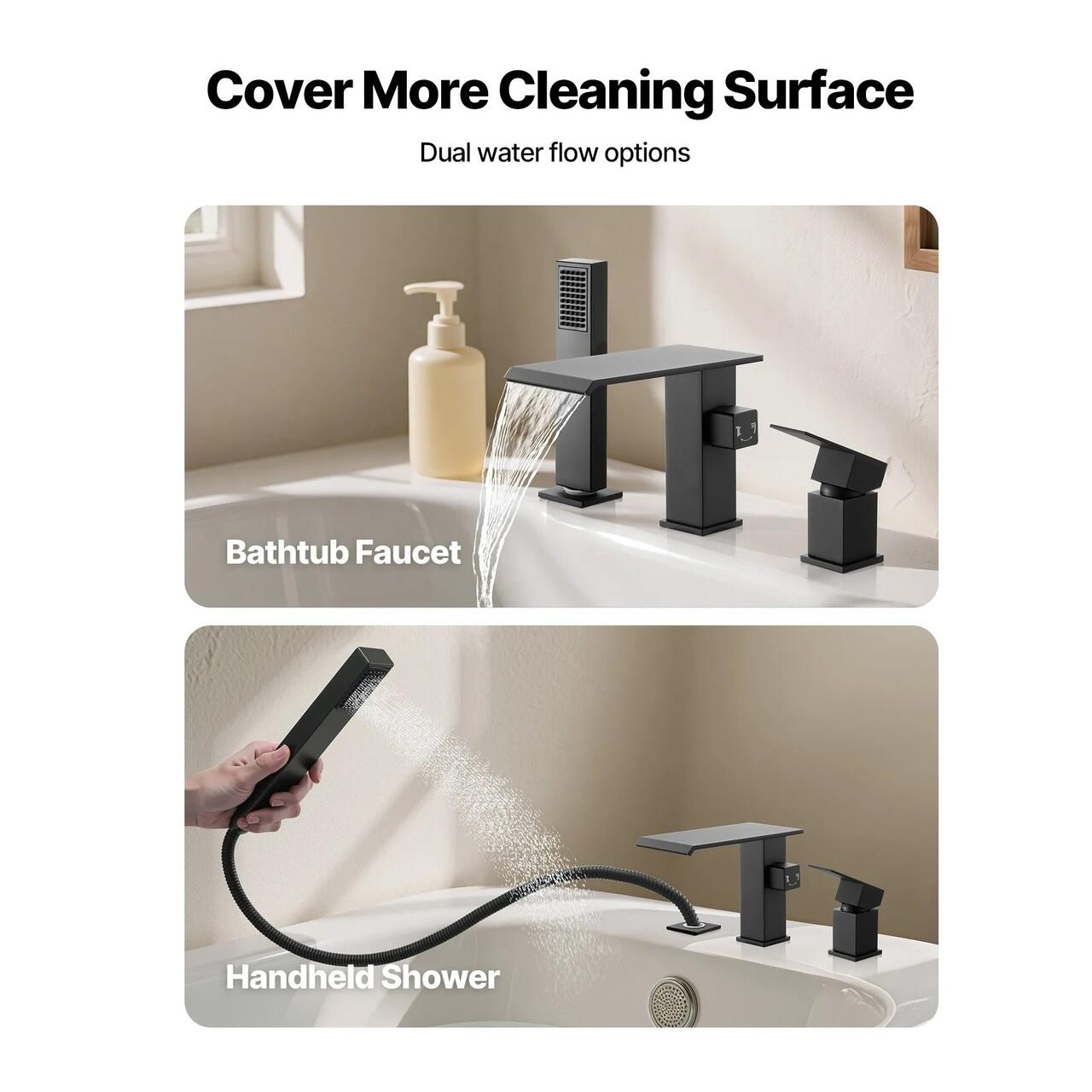 Debit versatil al apei: Avand moduri duble de debit al apei, acest robinet de cada roman cu cascada va permite sa comutati liber intre umplerea cazii si dusul manual. Largeste raza de curatare si se adapteaza usor la diverse nevoi, facand baia mai convenabila si mai temeinica.