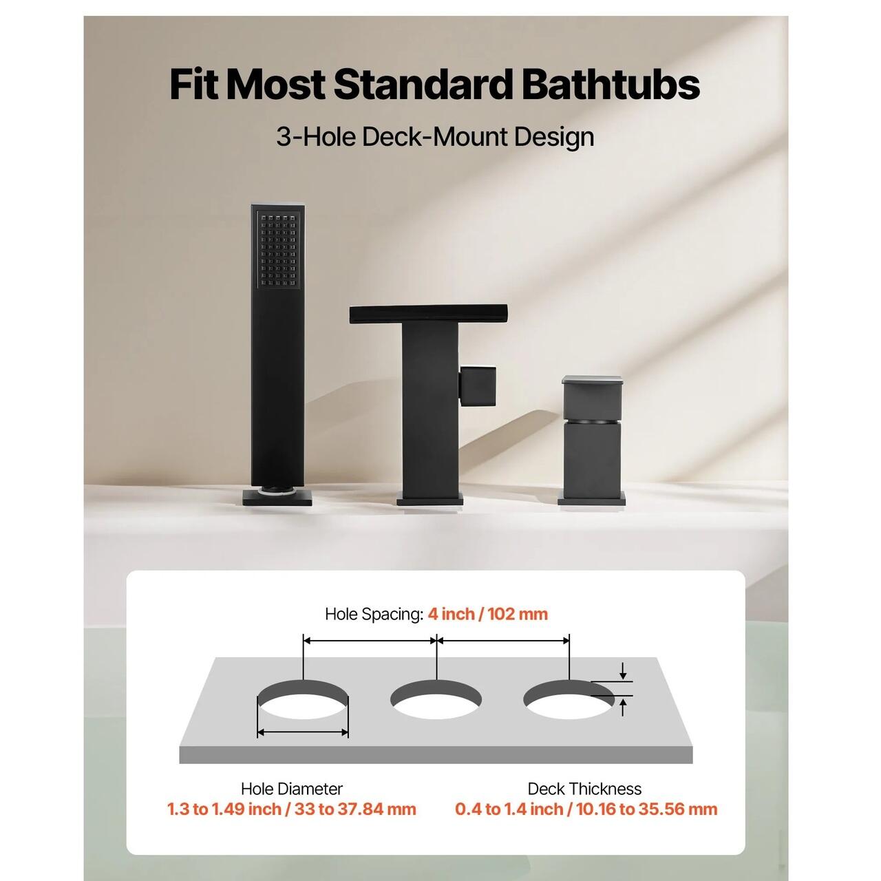 Montare cu 3 gauri: Aceasta baterie pentru cada romana are un design de montare pe platforma cu 3 gauri, compatibil cu majoritatea cazilor. Se potriveste cu gauri de instalare cu diametrul de 33 pana la 37,84 mm si grosimi ale platformei de 10,16 pana la 35,56 mm, oferind o potrivire flexibila in diverse configuratii de baie.