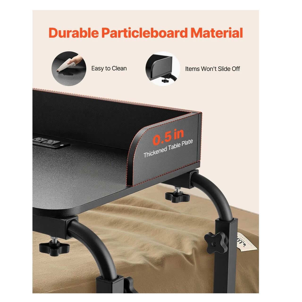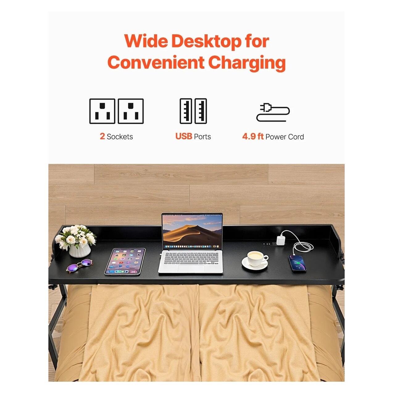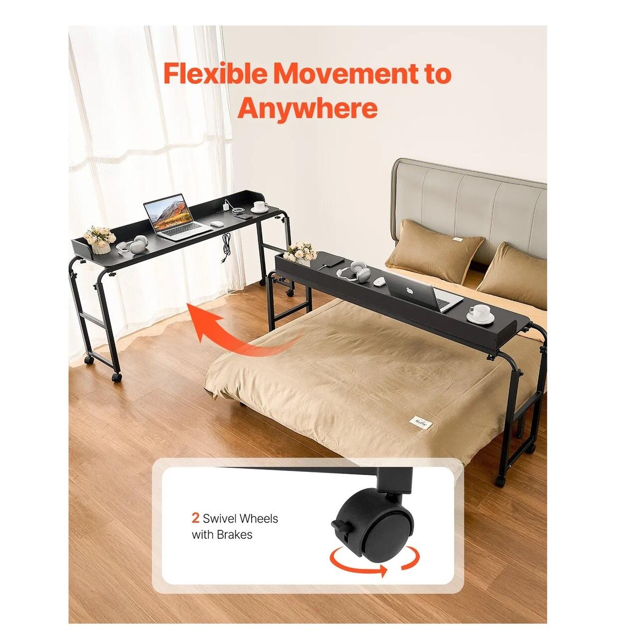 Birou mobil pentru pat, 4 x roti, Negru, 2 x Priza, 2 x USB, Lungime si Inaltime extensibila