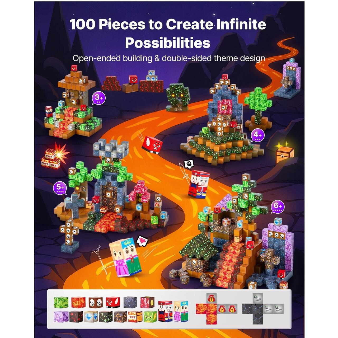Constructie libera si teme cu doua fete: Cu 100 de blocuri magnetice si teme cu doua fete, copilul tau poate crea modele plate, structuri 3D si chiar recreari emblematice! Combina si asorteaza cu alte seturi de blocuri magnetice pentru a construi povesti noi.