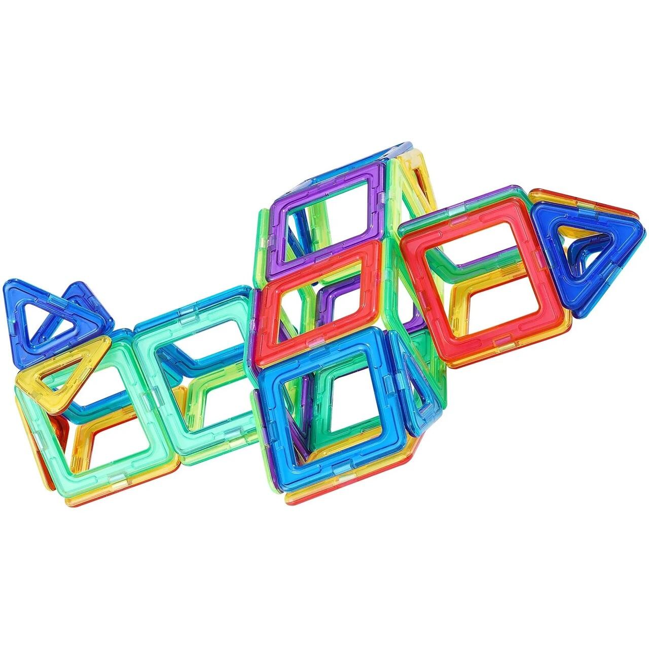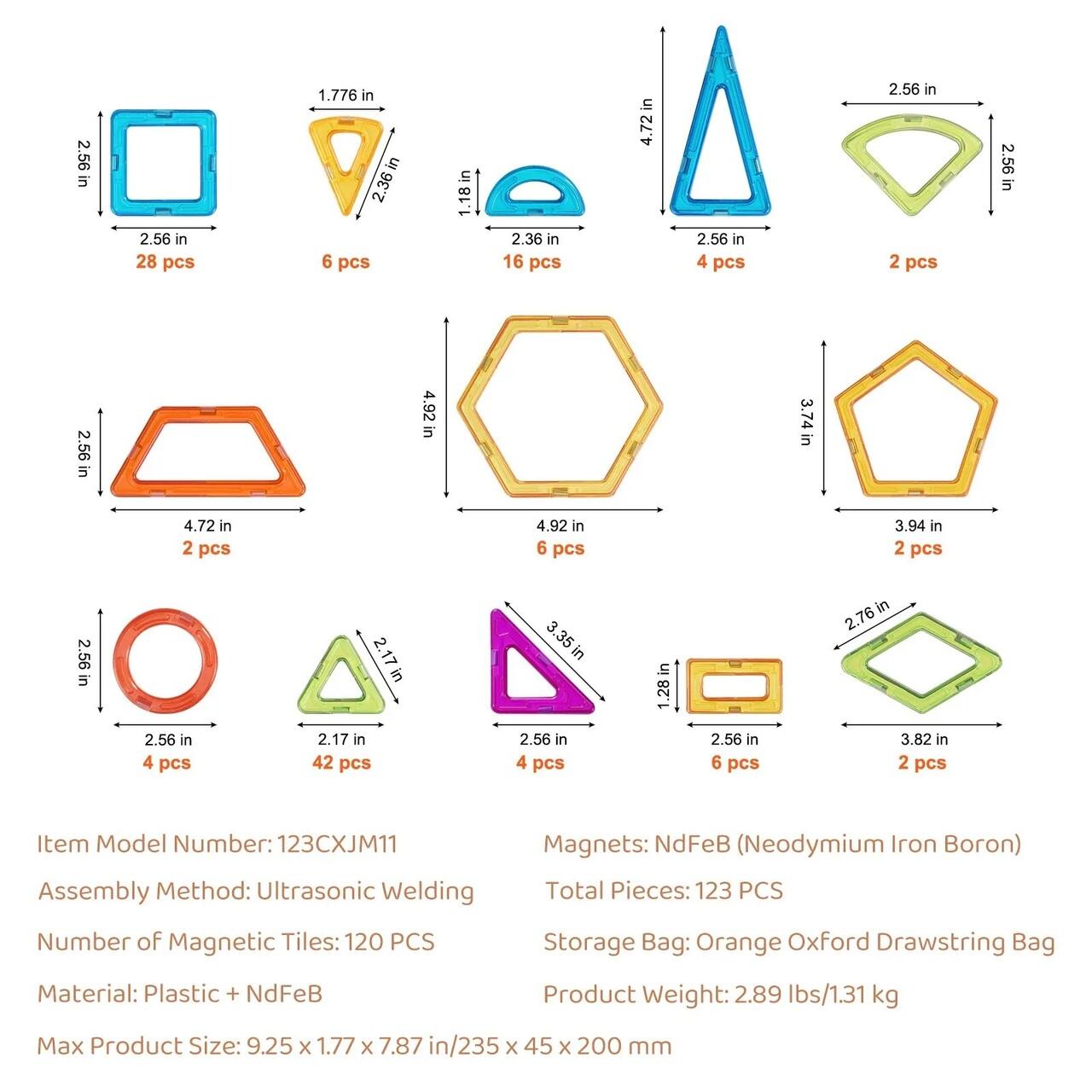 Mega Pachet cu 123 de piese: Dezlantuie creativitatea copilului tau cu setul de placi magnetice! Acest pachet captivant include 123 de piese magnetice - 28 de patrate, 42 de triunghiuri si 16 semicercuri - perfecte pentru construirea de structuri inalte, cladiri si castele puternice. In plus, vine cu o cutie robusta de depozitare din plastic, pastrand totul organizat si ordonat.